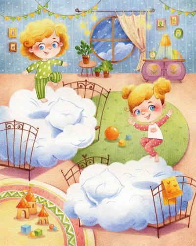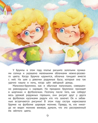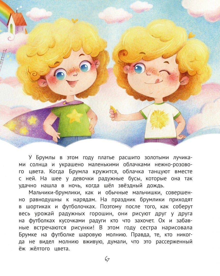 Brumka and Brumla are ordinary toddlers who love to play, run, romp and cuddle with their parents. Or not so ordinary. After all, they live on clouds, eat porridge with pieces of rainbow, fly kites, grow sunbeams and admire stars in aquariums!