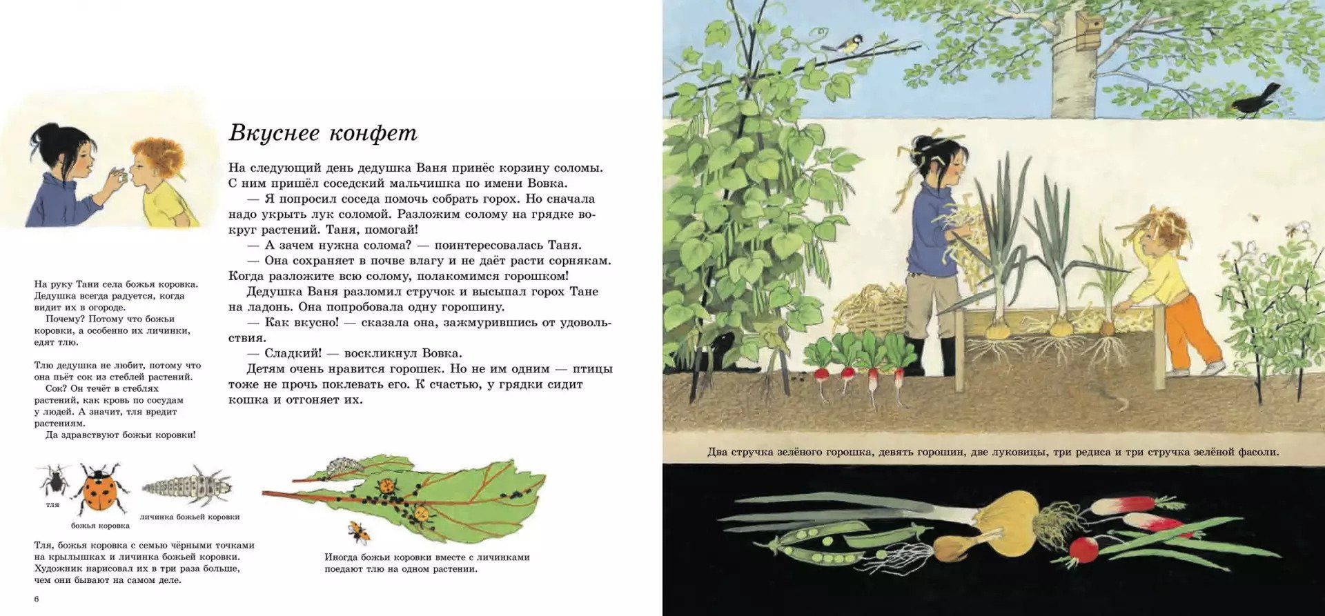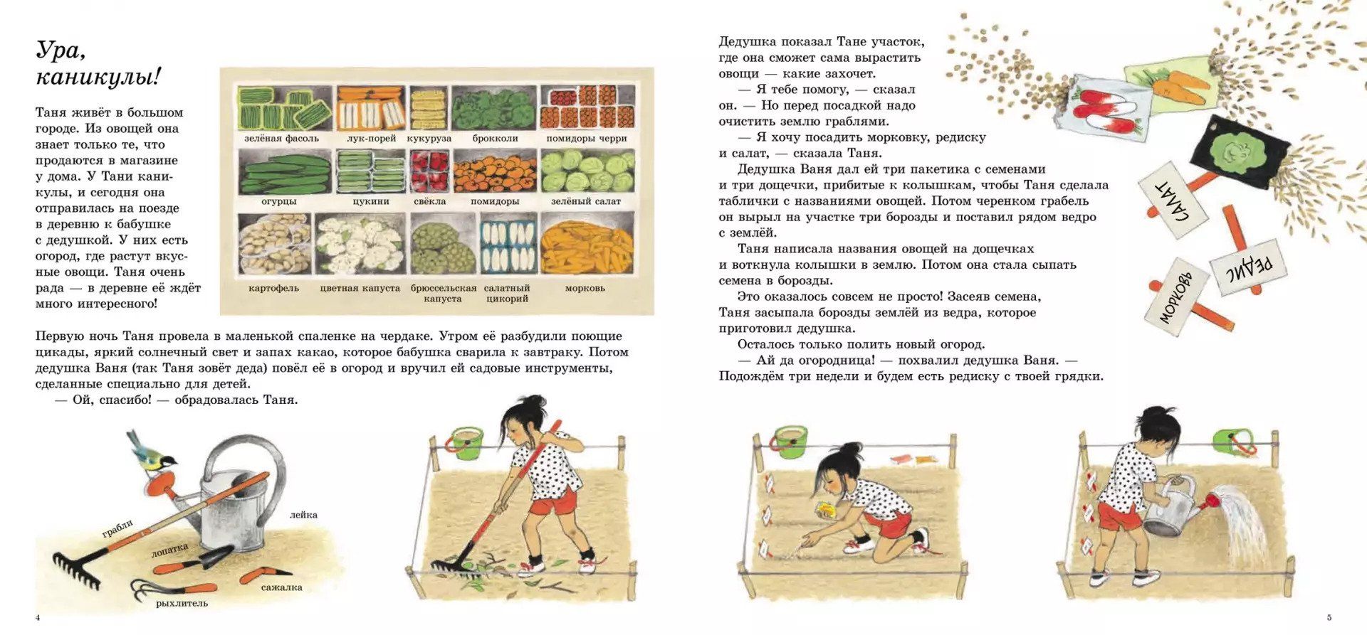 A vegetable garden is a magical place where children who grew up in the city can observe the life and growth of plants. The girl Tanya, the heroine of this story, went on vacation to the village to her grandparents, who teach her how to plant and grow vegetables, handle garden tools and harvest. Tanya will learn a lot of interesting things about those plants whose fruits she has previously seen only on the shelves of stores: how green peas are born and grow, what role insects and birds play in the life of plants, how to prepare a delicious salad and how to grow crisp radishes and juicy greens in your own apartment, arranging a small vegetable garden on the balcony or windowsill. A unique book with magnificent illustrations by Gerda Muller, a classic of children's literature, visually and playfully telling children about growing vegetables in a garden plot or vegetable garden. The book is especially relevant at the height of the dacha season and in anticipation of the harvest season.