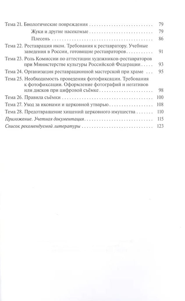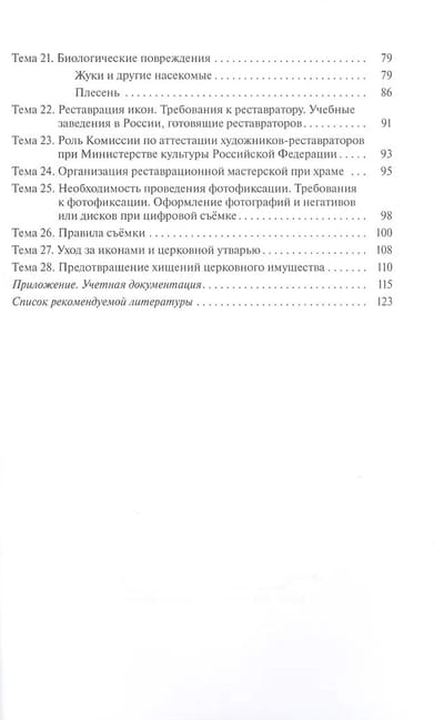 This practical guide is primarily intended for church rectors, sacristans, custodians, and altar servers. It will also be useful for those who have icons at home. It explains the causes of icon deterioration and deterioration, including climate change, biological and mechanical damage, and unprofessional restoration. Illustrations help identify the types of damage. Rectors should know how to clean churches and care for icons to prevent damage, as well as who can and cannot be trusted to restore worn icons. Protecting your treasures from theft is crucial; to this end, all icons, utensils, liturgical books, and vestments must be inventoried, described, and photographed. The book provides sample accounting documents and recommendations for their completion.