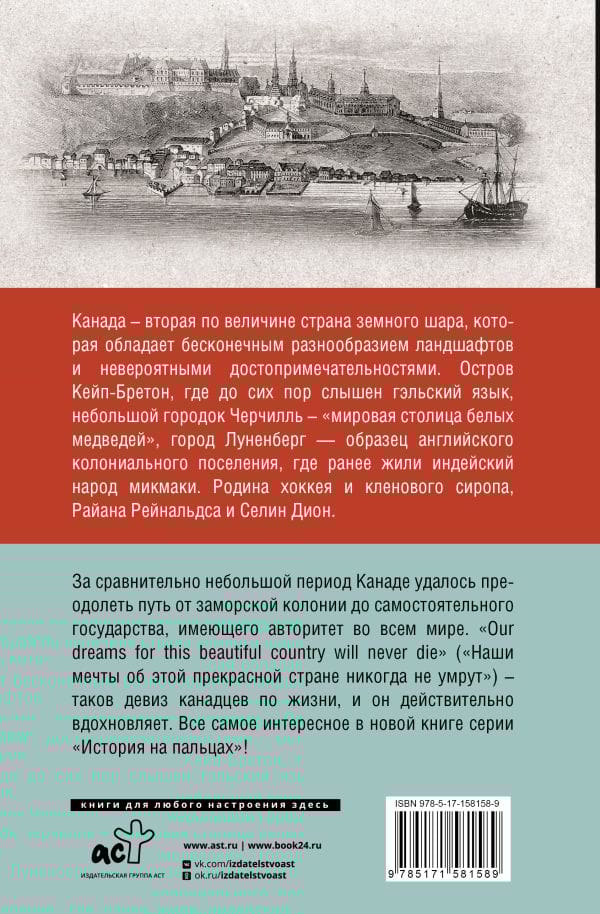 Canada is the second largest country on the globe, with an endless variety of landscapes and incredible sights. Cape Breton Island, where the Gaelic language can still be heard, the small town of Churchill - the "polar bear capital of the world", the town of Lunenberg - an example of an English colonial settlement, formerly home to the Mi'kmaq Indian people. Home of hockey and maple syrup, Ryan Reynalds and Celine Dion. In a relatively short period of time, Canada has managed to go from an overseas colony to an independent nation with authority around the world. "Dreams for this beautiful country will never die" - this is the motto of Canadians in life, and it really inspires. All the most interesting things in the new book of the series "History on your fingers"!