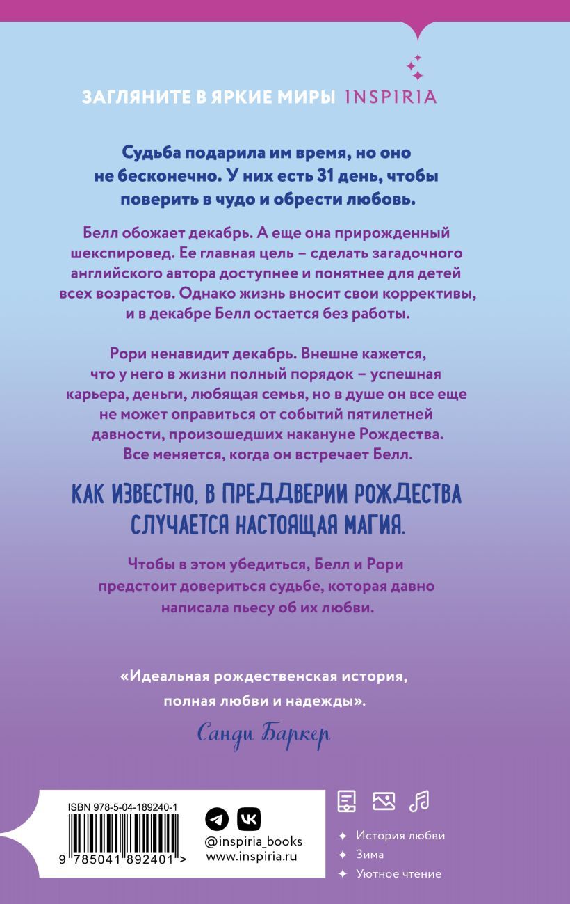 The perfect novel to welcome winter with. This book is like the very movie we re-watch every year to believe in a miracle again, and the glowing snow glitter on the cover will create the atmosphere of a winter fairy tale. Fate has given them the gift of time, but it's not infinite. They have 31 days to believe in a miracle and find love. Bell loves December. She's also a born Shakespearean scholar. Her main goal is to make the enigmatic English author more accessible and understandable to children of all ages. But life takes its toll, and in December Bell is out of a job. Rory hates December. Outwardly it seems that his life is in order - a successful career, money, loving family, but in his heart he still can not recover from the events of five years ago, which occurred on Christmas Eve. Everything changes when he meets Bell. As we know, the real magic happens on the eve of Christmas. To see for themselves, Bell and Rory will have to trust fate, which wrote the playbook for their love long ago. 31 days to fall in love while it snows.