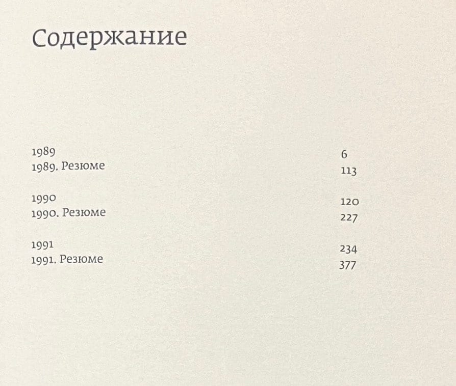 The second volume tells about the films and events of 1989-1991, the last three years of the Soviet Union: the withdrawal of Soviet troops from Afghanistan, the emergence of the groups Lyube, Na-Na and Kolibri, Tyagunov’s Noga and Todorovsky’s Interdevochka, the death of the Komsomolets submarine and Abdrashitov’s Armavir, Sakharov’s speech at the First Congress of People’s Deputies and Solovyov’s House under the Starry Sky, the miners’ strikes in Kuzbass and Donbass, the return of Rostropovich and Vishnevskaya, Muratova’s Asthenic Syndrome and Balabanov’s Happy Days, The Night of the Sapper Shovels in Tbilisi, the fall of the Berlin Wall, Sokurov’s The Second Circle, the rise of the cooperative movement and the premiere of Field of Miracles, Kovalov’s Scorpion Gardens, Dostal’s Cloud-Paradise and Comrade Chkalov’s Passage through The North Pole by Pezhemsky, the murder of Men, the death of Dyagileva, the arrest of Chikatilo, It by Ovcharov, Dukhov Den by Selyanov and Satan by Aristov, the appearance of Barbie and Lego, the opening of McDonald's in Moscow and the "tobacco riot" in Leningrad, You Can't Live Like This by Govorukhin, Karaul by Rogozhkin and Sunset by Zeldovich, the success of Soviet cinema in Cannes, Freeze - Die - Rise! Kanevsky, "Mother" by Panfilov and "Taxi Blues" by Lungin, the awarding of the Nobel Prize to Gorbachev, interethnic conflicts in the Union republics, the collapse of communist regimes in Eastern Europe and the "parade of sovereignties", "The Tsaricide" by Shakhnazarov and "The Myth of Leonid" by Dolinin, the arrival of Yeltsin, the signing of the Belovezh Accords and, finally, the collapse of the USSR.