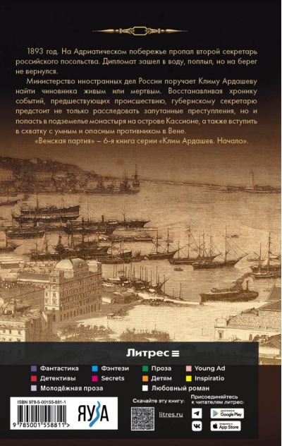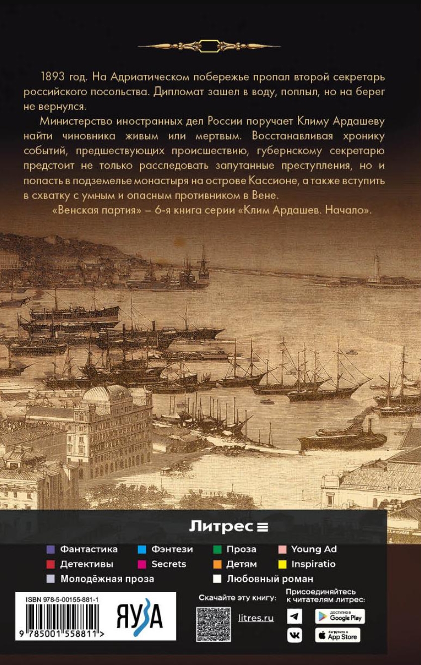 1893. The second secretary of the Russian embassy disappeared on the Adriatic coast. The diplomat waded into the water, swam, but never returned to shore. The Russian Ministry of Foreign Affairs tasks Klim Ardashev with finding the official, dead or alive. Retracing the events leading up to the incident, the provincial secretary must not only investigate complex crimes but also penetrate the dungeons of a monastery on the island of Cassione and confront a clever and dangerous adversary in Vienna. "The Vienna Party" is the sixth book in the "Klim Ardashev: The Beginning" series.