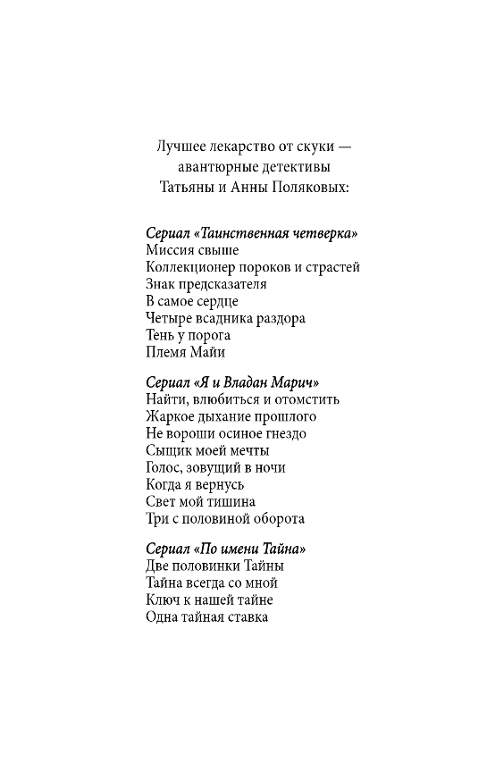Little Tatyana was raised by her father as if he were training her to be a super-agent, but one day her father disappeared, and the girl ended up in an orphanage. As an adult, Tanya joined the police. She's a physical training instructor, but she's always ready to help her colleagues with investigations, even if it's simply a case of a student's missing laptop. However, over time, Tatyana begins to suspect that the laptop's disappearance triggered a series of murders that are happening one after another around the student. She needs to find it urgently to stop the crimes.