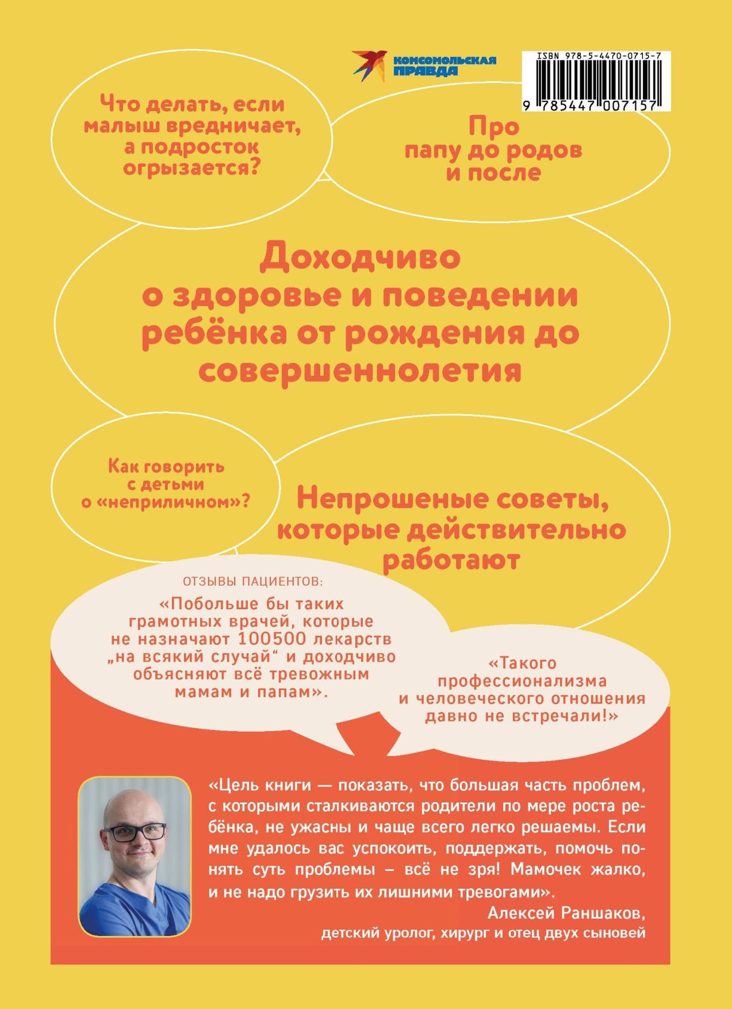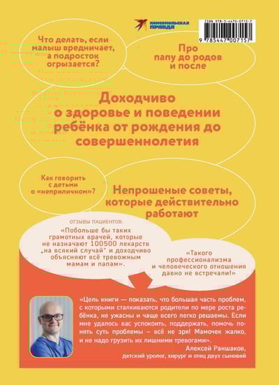 "I feel sorry for the moms! A guide to the child that could be given in the maternity hospital" is a gentle support for all anxious mothers. Pediatric urologist, surgeon, father of two little ones Alexey Ranshakov tells about all stages of a child's life - from birth to graduation - without complex medical terms and with humor. You will understand when you should really worry, and when you definitely shouldn't. The purpose of the book is to show that most of the problems that parents face as their child grows are not terrible and are most often easily solved. It is not for nothing that patients are happy - "We need more competent doctors like this, who do not prescribe 100500 drugs "just in case" and clearly explain everything to anxious mothers and fathers." The author of the book explains the pitfalls of complementary feeding (meat is better than zucchini) and potty training using specific examples, about what tasks should be delegated to dad and what to do if dad shirks, what colds are considered "contagious"; gives practical advice on how to survive the three-year and teenage crises, and many more useful recommendations for every day for parents.