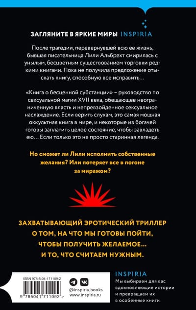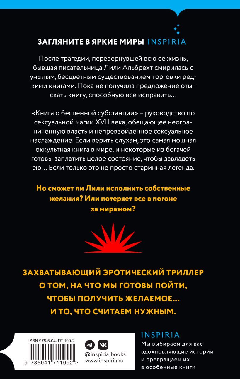 After a life-changing tragedy, former writer Lily Albrecht has resigned herself to a dull, colorless existence as a rare book dealer. Until she received an offer to find a book that could fix everything... "The Book of Priceless Substance" - a manual of sexual magic of the XVII century, promising unlimited power and unrivaled sexual pleasure. If rumors are to be believed, it's the most powerful occult book in the world, and some of the rich are willing to pay a fortune to possess it... Unless it's just an old legend. But will Lily be able to fulfill her own wishes? Or will she lose everything in pursuit of a mirage?