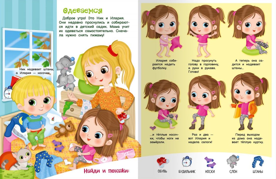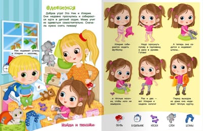 The book "I know how to dress and put on shoes" will teach your child to put on clothes, get ready for a walk, and tie shoelaces in an entertaining way. Charming colorful illustrations will definitely interest the child, which will contribute to better assimilation of what is read.