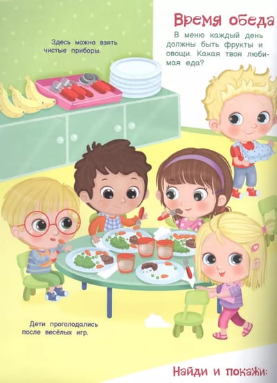 In each section, the child will have a "find and show" task, which will help develop the child's attentiveness, and in the middle of the book there is an insert with stickers. Stickers will turn reading into an exciting game and will help develop fine motor skills.