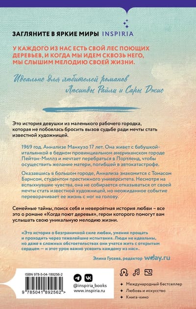 The perfect story for fans of Sarah Gio and Lucinda Riley's books. Family secrets, the search for self, and an incredible love story are all about When the Trees Sing, a novel whose characters will help you hear their unique melody of life. This is the story of a girl from a small working-class town who was not afraid to defy fate for the sake of her dream of becoming a famous artist.