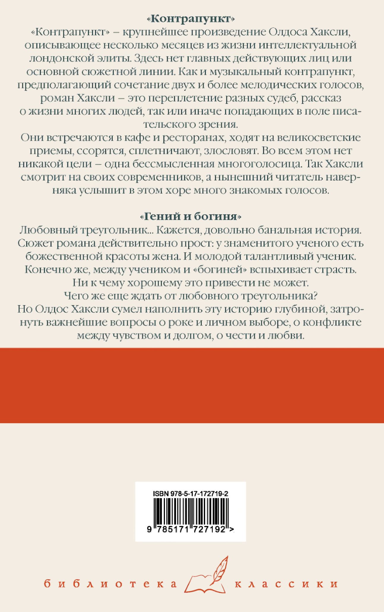 Aldous Huxley's largest work, describing several months in the life of the intellectual London elite. There are no main characters or main plot line. Like musical counterpoint, which involves the combination of two or more melodic voices, Huxley's novel is an interweaving of different destinies, a story about the lives of many people who somehow fall into the writer's field of vision.