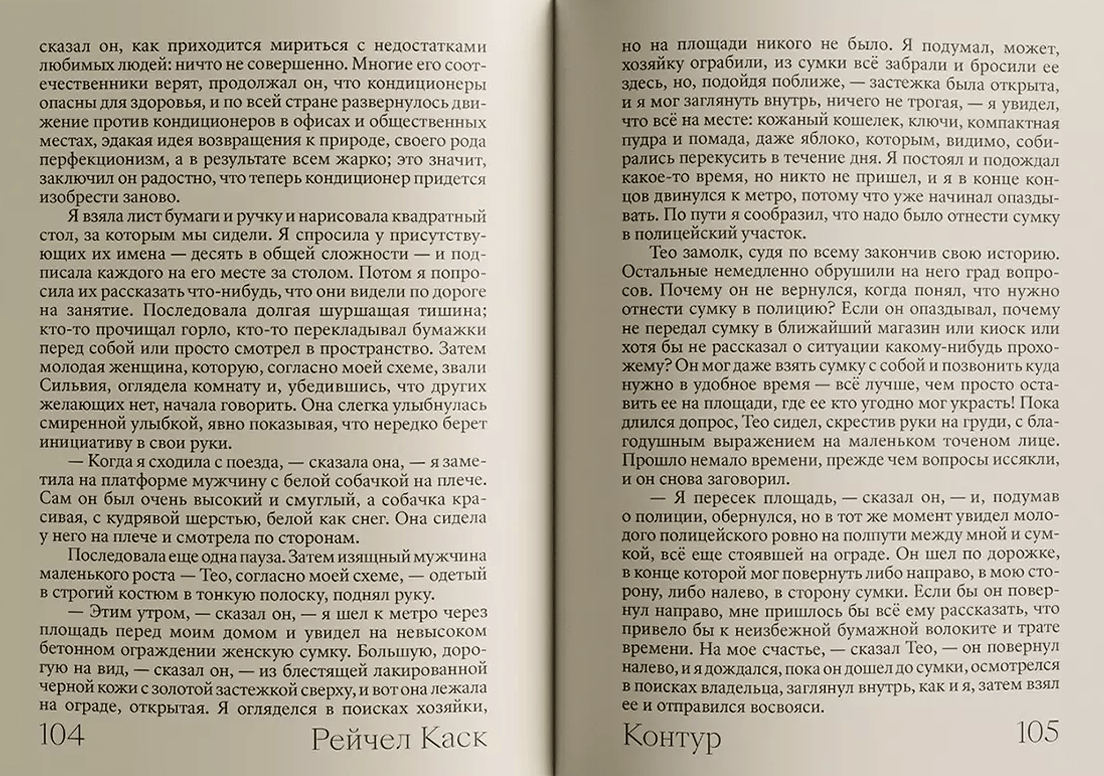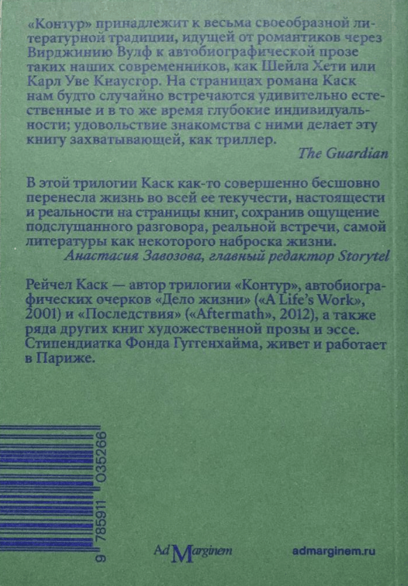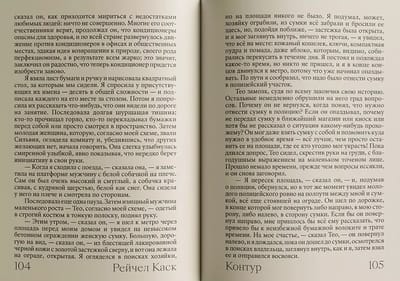 The novel by contemporary Canadian-British writer Rachel Cusk (born 1967), which has collected many awards, consists of ten meetings and conversations. In an unbearably hot summer in Athens, the protagonist, a well-known novelist, is teaching a creative writing course. Her new acquaintances and interlocutors are her neighbors, students and teachers, who willingly talk about themselves - sharing their beliefs, dreams, fantasies, anxieties and regrets. Against the background of their stories, as if by contrast, a portrait of the narrator - a woman who learns to live with the consciousness of great loss. "Contour" - the first novel of a trilogy that changed the ideas about this traditional literary form and significantly expanded the boundaries of modern literature. For the first time in Russian.