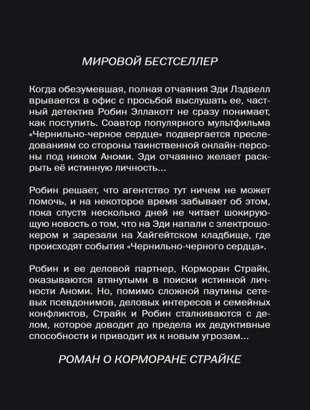 Edie Ledwell, creator of the popular cartoon "Inkblack Heart," contacts Strike and Robin's agency. She tells of cyberbullying and asks Robin to help her find a man nicknamed "Anomie," whose online harassment drove her to attempt suicide. He writes vile rumors about her, accuses her of every mortal sin, and suggests she continue her attempts to take her own life. Robin, citing the agency's full schedule, suggests she contact someone who specializes in cybercrime. The woman leaves, but shortly afterward, the media reports her death – Edie was brutally murdered in a cemetery, and her partner in the cartoon, Josh Blay, was taken to the hospital in critical condition.