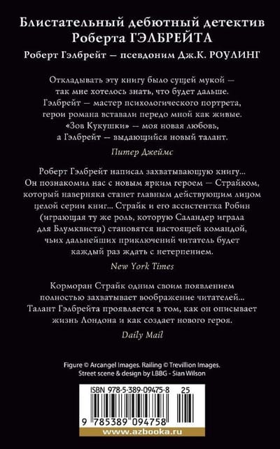When a scandalously famous top model, falling from the snowy balcony of her penthouse, crashes to death, everyone decides that it is suicide. But the girl's brother cannot accept this conclusion and turns to the services of a private investigator named Cormoran Strike. Strike has been through the war, suffered physically and mentally; his life has been derailed. Now he expects to close at least a financial gap, but the investigation turns into an insidious trap. Deepening into the tangled history of a young star, Strike reveals the secret underside of events - and himself moving towards mortal danger ... Exciting, polished plot unfolds against the backdrop of London, from the quiet streets of respectable Mayfair to the shabby pubs of the East End and round-the-clock bustling Soho. "The Cuckoo's Calling" is an unremarkable and deservedly popular novel in which Cormoran Strike first appears. It is also J.K. Rowling's first work set in the detective genre and signed with Robert Galbraith's name.
