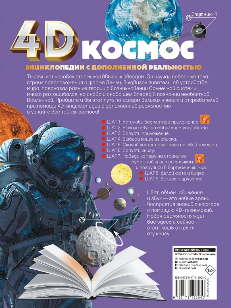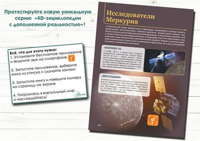 This 4D encyclopedia with augmented reality introduces the reader to the vastness of space. It contains comprehensive information about how people have been reaching for the stars for thousands of years and gradually learning about the unattainable, but so alluring sky: they built observatories, made maps of constellations, invented aircraft, launched a man into space, landed on the Moon, went out into open interplanetary space... And all this in order to learn as much as possible about the planets, the Sun, galaxies, asteroids and many other space objects. Today, you can study each of them in detail and comprehensively right here - on the pages of this 4D encyclopedia. Having discovered the world of space in three-dimensional "live" pictures with sound, you will seem to find yourself on board a spaceship and be amazed with your own eyes by the grandeur and infinity of eternal space.