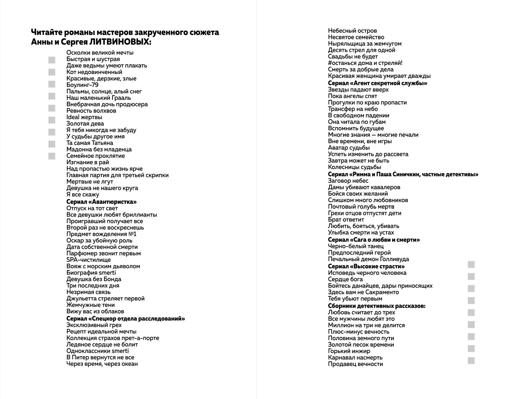 Anna and Sergey Litvinov are a unique literary duo, masters of the action genre. They won the hearts of readers from their very first book. Since 1998, they have published over 80 novels and seven short story collections, with a combined circulation of over 10 million copies. Numerous film adaptations of the Litvinovs' novels have been made, including "The Adventuress," "The Private Investigation of a Retired Colonel," "Special Correspondent of the Investigation Department," "One Life for Two," and others.