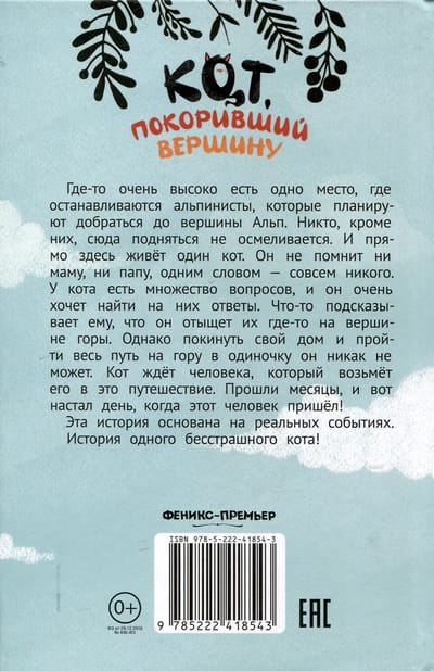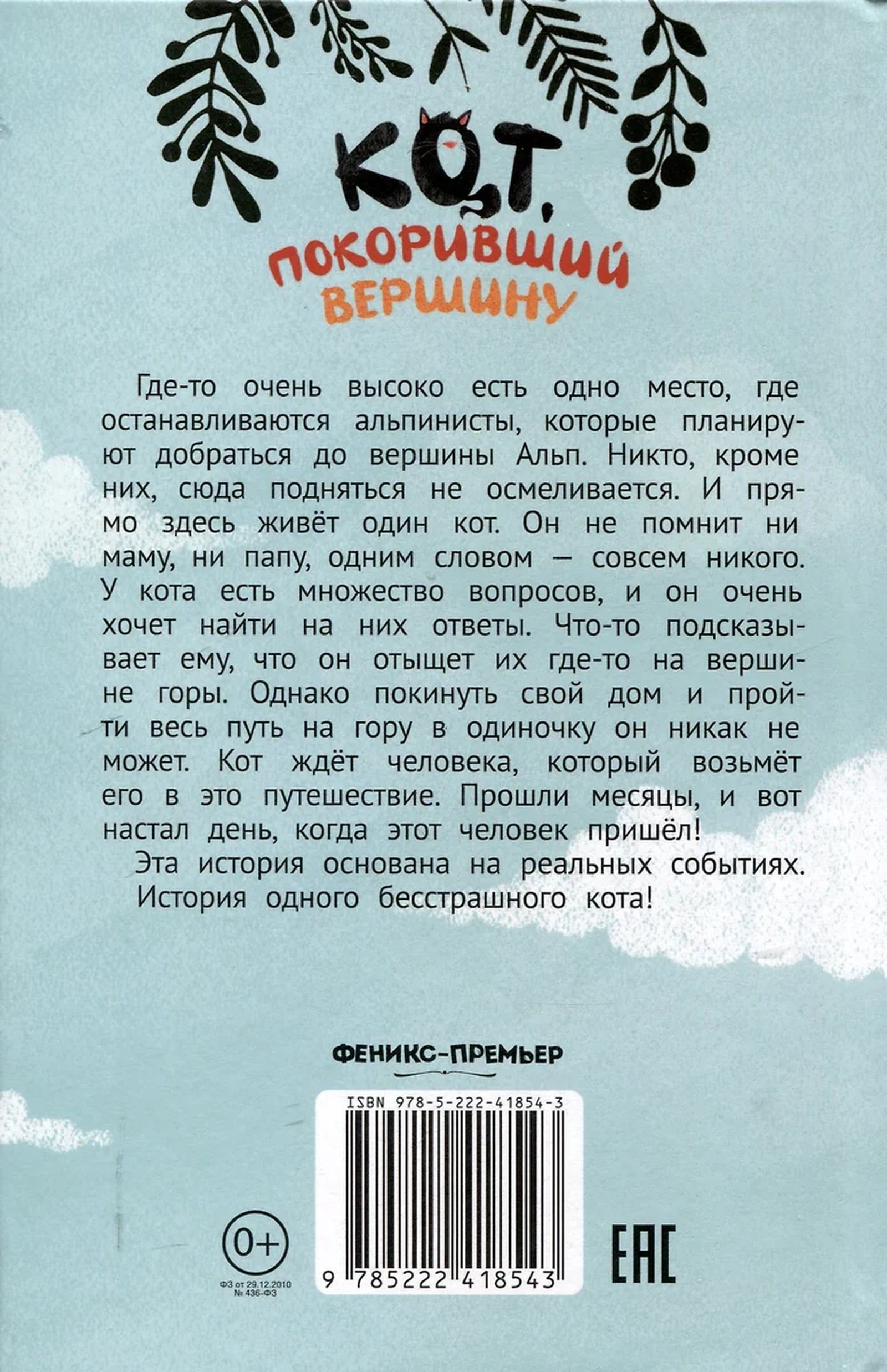 Somewhere very high up there is a place where mountain climbers stop who plan to reach the top of the Alps. No one else dares to climb here. And right here lives one cat. He does not remember his mother or father, in a word - no one at all. The cat has many questions, and he really wants to find answers to them. Something tells him that he will find them somewhere on the top of the mountain. However, he cannot leave his home and go all the way to the mountain alone. The cat is waiting for a person who will take him on this journey. Months passed, and then the day came when this person came! This story is based on real events.