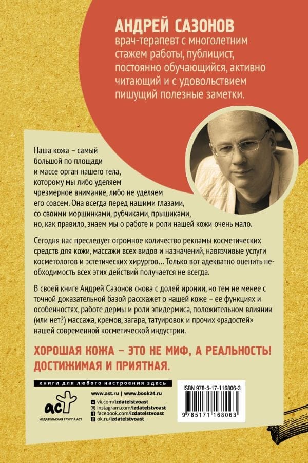 Today we are haunted by a huge number of advertisements of cosmetic products for the skin, massages of all kinds and appointments, obsessive services of beauticians and aesthetic surgeons ... But it is not always possible to adequately assess the need for all these actions. In his book, Andrei Sazonov again with a dose of irony, but nevertheless with accurate evidence base will tell about our skin - its functions and features, the work of the dermis and the role of the epidermis, the positive impact (or not?) massage, creams, tanning, tattoos and other "joys" of our modern cosmetic industry. Good skin is not a myth, but a reality. Achievable and enjoyable.