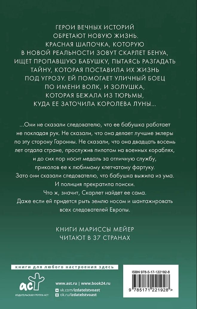 No one, that is, except for a mysterious street fighter nicknamed the Wolf, who agrees to help Scarlet. But can he be trusted? The heroes of timeless stories are given a new lease on life. Little Red Riding Hood, now named Scarlet Benoit in the new reality, searches for her missing grandmother, trying to unravel the mystery that has put their lives in danger. She is aided by a street fighter named the Wolf and Cinderella, who has escaped from prison where the Queen of the Moon imprisoned her.