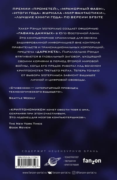During World War II, young math genius Lawrence Waterhouse is involved in breaking German encryption systems. In modern times, his grandson Randy, a computer hacker, helps build an autonomous "data haven" in Southeast Asia. The grandson's fate is tied to his grandfather's work, to an international conspiracy that could bring the world into bondage to a new totalitarianism. At times hilarious, densely packed with information on topics ranging from cryptanalysis and hacking to treasure hunting, this novel is a true modern epic. On the one hand - a marvelous, completely original portrait of the wartime era. On the other is a provocative reflection on how science and technology help shape-and change-the course of human history. A work of great erudition and equally great creative power, it is-and will remain-one of the great literary achievements of the modern era.