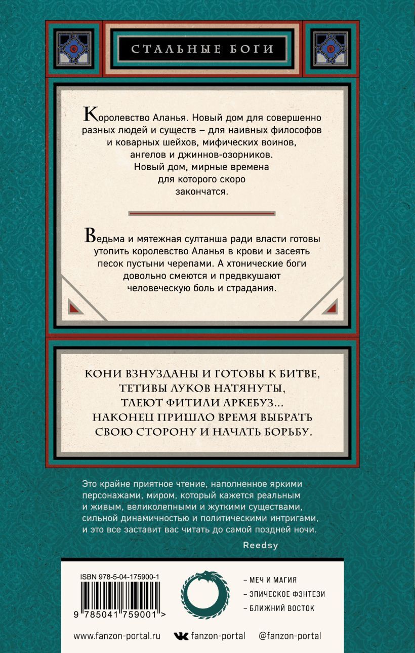 A blood-soaked sequel to the epic fantasy "Steel Gods", in which "Game of Thrones" mixes with "Arabian Nights".Mysterious warriors and mischievous djinns, vulgar poets and empty-headed philosophers, flying simurghs and cunning sheiks - all of them have found their home in the kingdom of Alanya. No one suspects that a power struggle between an ancient sorceress and a rebellious sultaness threatens to destroy their new homeland. The primordial gods laugh as they stir the boiling bloody cauldron.War horses gallop, arrows rain down, and cannon shots light up the night... And now everyone must choose their side.