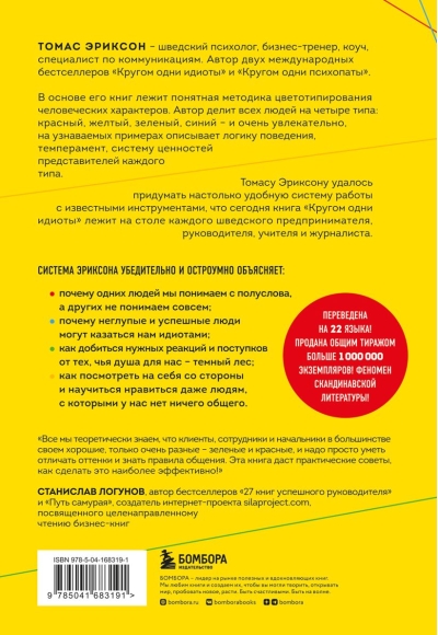 The book is based on a simple method for color-typing human characters. Swedish psychologist Thomas Erikson divides all people into four types: red, yellow, green, and blue. He uses recognizable examples to describe the behavioral logic, temperament, and value systems of representatives of each type in a captivating way. It would seem that this is nothing new. A similar approach has been used by psychologists for decades. But Thomas Erikson managed to devise such a convenient system for working with well-known tools that today, "Surrounded by Idiots" is on the desk of every Swedish executive, teacher, and journalist.