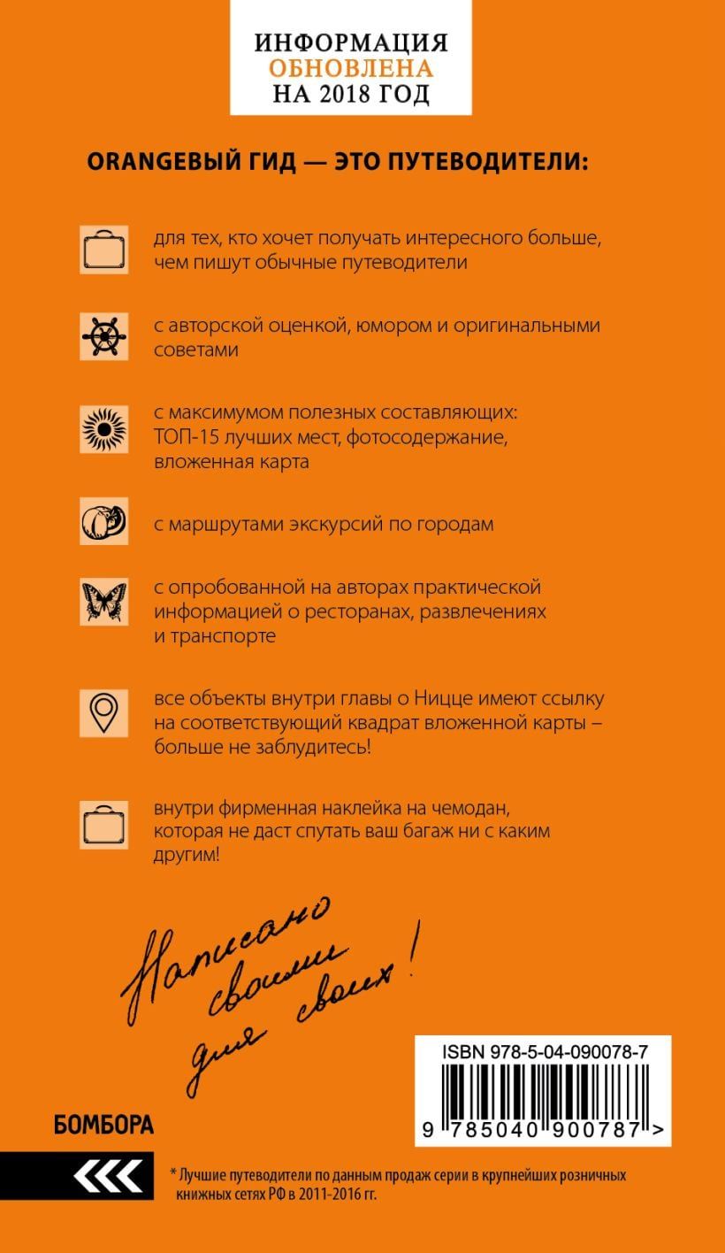 The Orange Guide welcomes you to the enchanting Côte d'Azur of France! Together with him you will plunge into the atmosphere of the serene and festive life of the coast. The guide offers routes on "tourist trails" and unique author's walks "for your own". Feel like a star, choosing the route "The Capital of Cinema - Cannes", join the world of art - walks "In the footsteps of Renoir", "Arles - the city of Van Gogh", give free rein to your excitement in Monte Carlo - "Where they lost fortunes", visit the legendary castle of If - "Prison of the Count of Monte Cristo" .... The book includes detailed maps of the cities and coastal areas so you don't get lost and feel at home. In the new edition - new useful information: what to do during the rain, what you can do for free, and what you can not feel anywhere else in the world! Happy traveling!