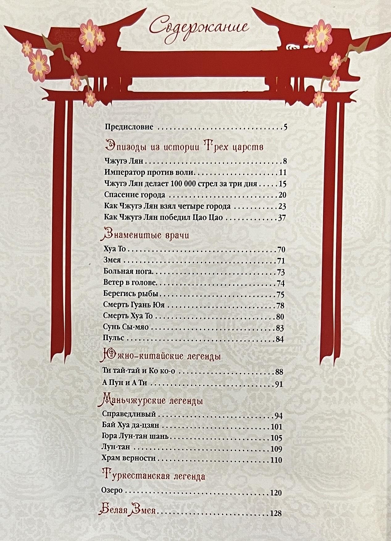 The collection includes episodes from the history of the "Three Kingdoms", legends about famous Chinese doctors, South Chinese, Manchurian and Turkestan legends, as well as the legend of the White Snake, which is based on real historical facts.