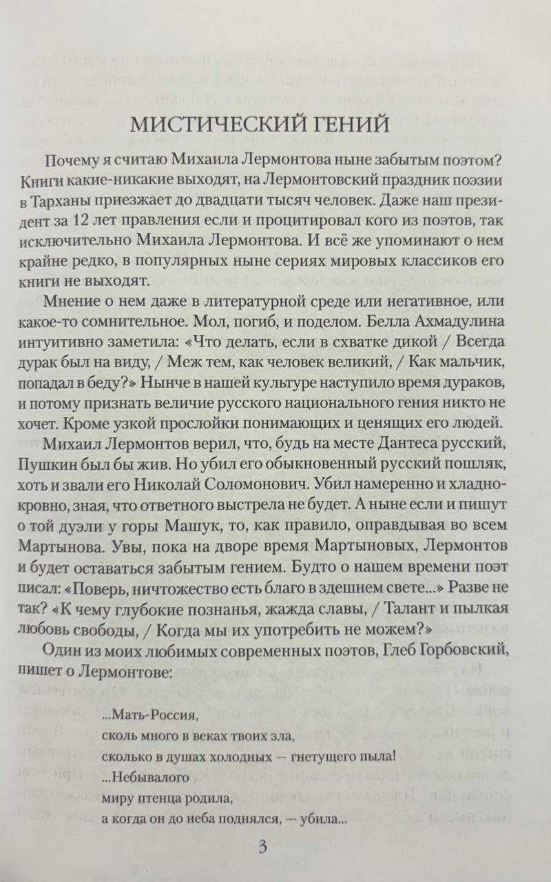 The author sharply opposes all mystifications and gossip about the poet. For him, Lermontov, with all his contradictions, despite all the complexity of his character, is, above all, the greatest national Russian genius, who recognized his tragic mission very early on.