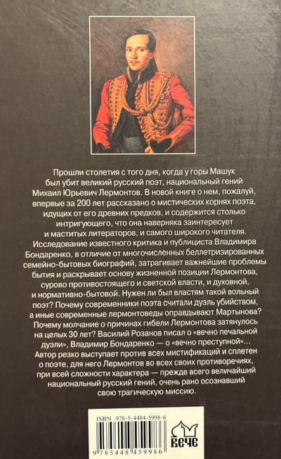 This study by renowned critic and publicist Vladimir Bondarenko, unlike numerous fictionalized biographies focusing on family and everyday life, addresses the most important issues of existence and reveals the foundation of Lermontov's life, a stern opponent of secular, spiritual, and normative authorities. Did the authorities need such a freewheeling poet? Why did the poet's contemporaries consider the duel murder, while some modern Lermontov scholars vindicate Martynov? Why did the silence about the causes of Lermontov's death last for 30 years? Vasily Rozanov wrote of an "eternally sad duel," Vladimir Bondarenko of an "eternally criminal" one...