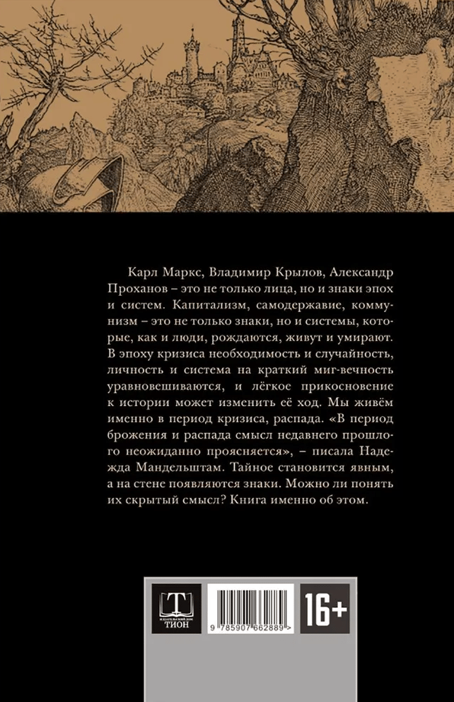 Karl Marx, Vladimir Krylov, and Alexander Prokhanov are not only faces, but also signs of epochs and systems. Capitalism, autocracy, and communism are not only signs, but also systems that, like people, are born, live, and die. In the epoch of crisis, necessity and chance, personality and system are balanced for a brief moment and eternity, and a light touch on history can change its course. We live precisely in a period of crisis, of disintegration. "In the period of fermentation and disintegration, the meaning of the recent past suddenly becomes clear," wrote Nadezhda Mandelstam. The secret becomes revealed, and signs appear on the wall. Is it possible to understand their hidden meaning? This book is about that.