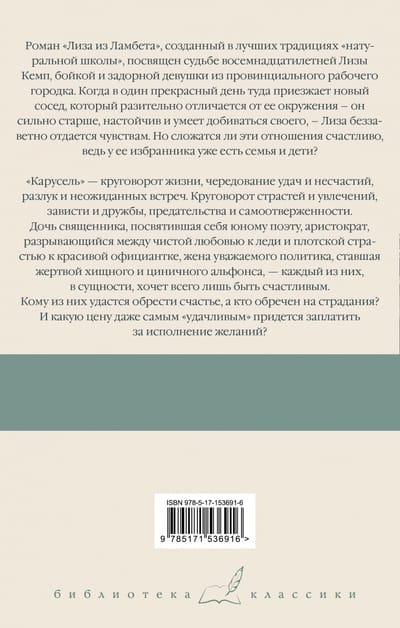 The novel "Lisa of Lambeth", created in the best traditions of the "natural school", is devoted to the fate of eighteen-year-old Lisa Kemp, perky and fun girl from a provincial working-class town. When one day there comes a new neighbor who is strikingly different from her environment - he is much older, persistent and able to achieve their own - Lisa selflessly gives herself to the feelings. But will this relationship be happy, because her chosen one already has a family and children? "Carousel" - the cycle of life, alternating fortunes and misfortunes, separations and unexpected meetings. The cycle of passions and infatuations, envy and friendship, betrayal and selflessness. The daughter of a priest, devoted to a young poet, an aristocrat, torn between pure love for a lady and carnal passion for a beautiful waitress, the wife of a respected politician, victimized by a predatory and cynical alfonsa - each of them, in fact, wants only to be happy. Which of them will succeed in finding happiness, and which of them is doomed to suffer? And what price will even the most "lucky" have to pay for the fulfillment of their desires?
