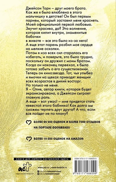 Jason Thorne is my brother's friend. How much I had a crush on that boy when I was a kid! He was the first guy who made me blush. My official first love. Sounds beautiful, doesn't it? That excitement that boils inside, the famous butterflies in my stomach - it was all because of him! And that guy also broke my heart into tiny shards. Then I tried my best to avoid him, and believe me, it was hard since he was friends with my brother. When he finally moved out, I was ready to forget he ever existed. Now he's a movie star. Someone whose smile and dimpled cheeks drive women of all ages wild. But not me. I'm Olive, the author of the book that's going to be made into a movie, with Jason playing the lead. And then, horror of horrors. - I'm going to be that womanizer's fiancée! How long can we put up with each other? And what if things don't go according to plan?