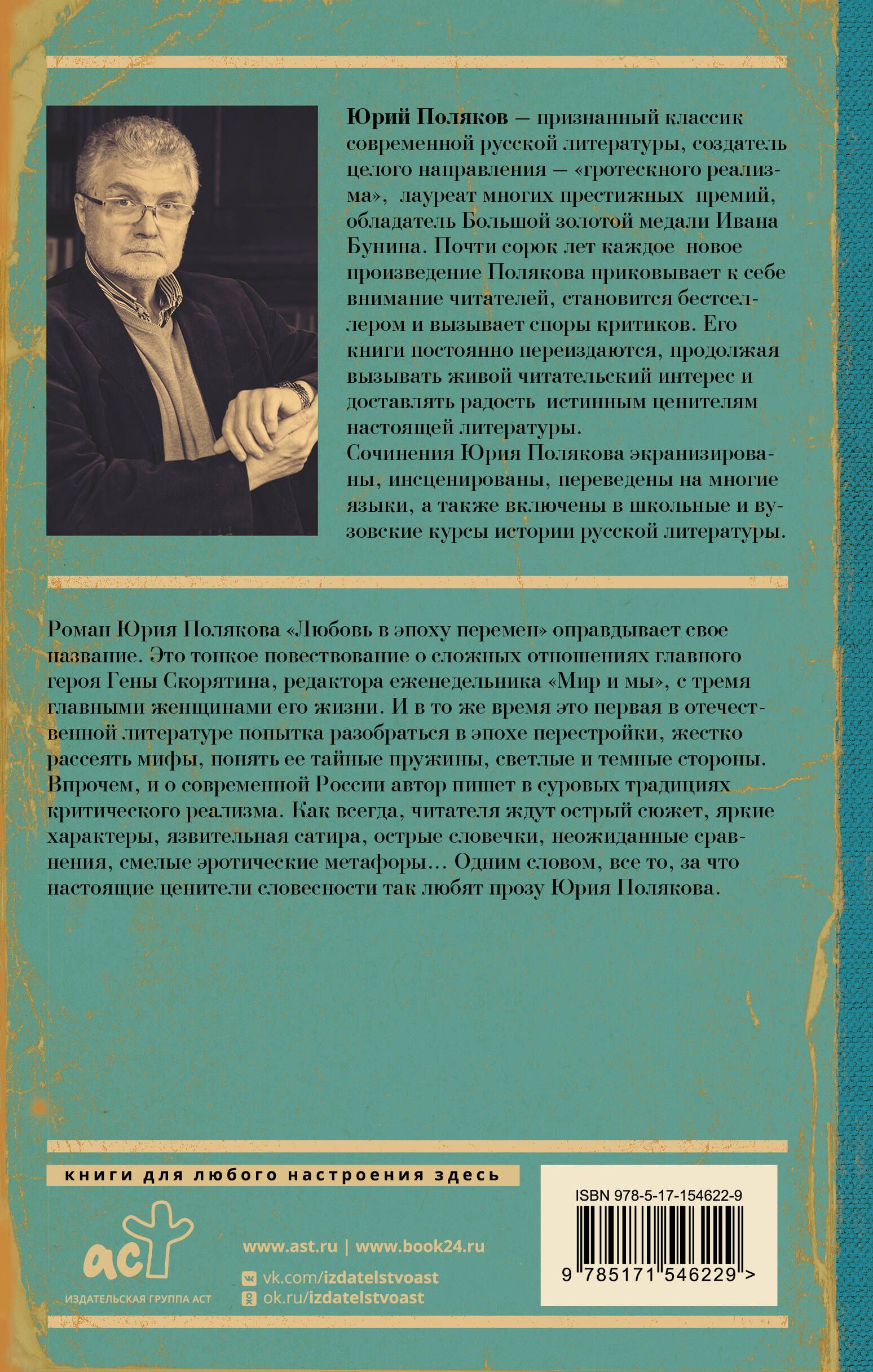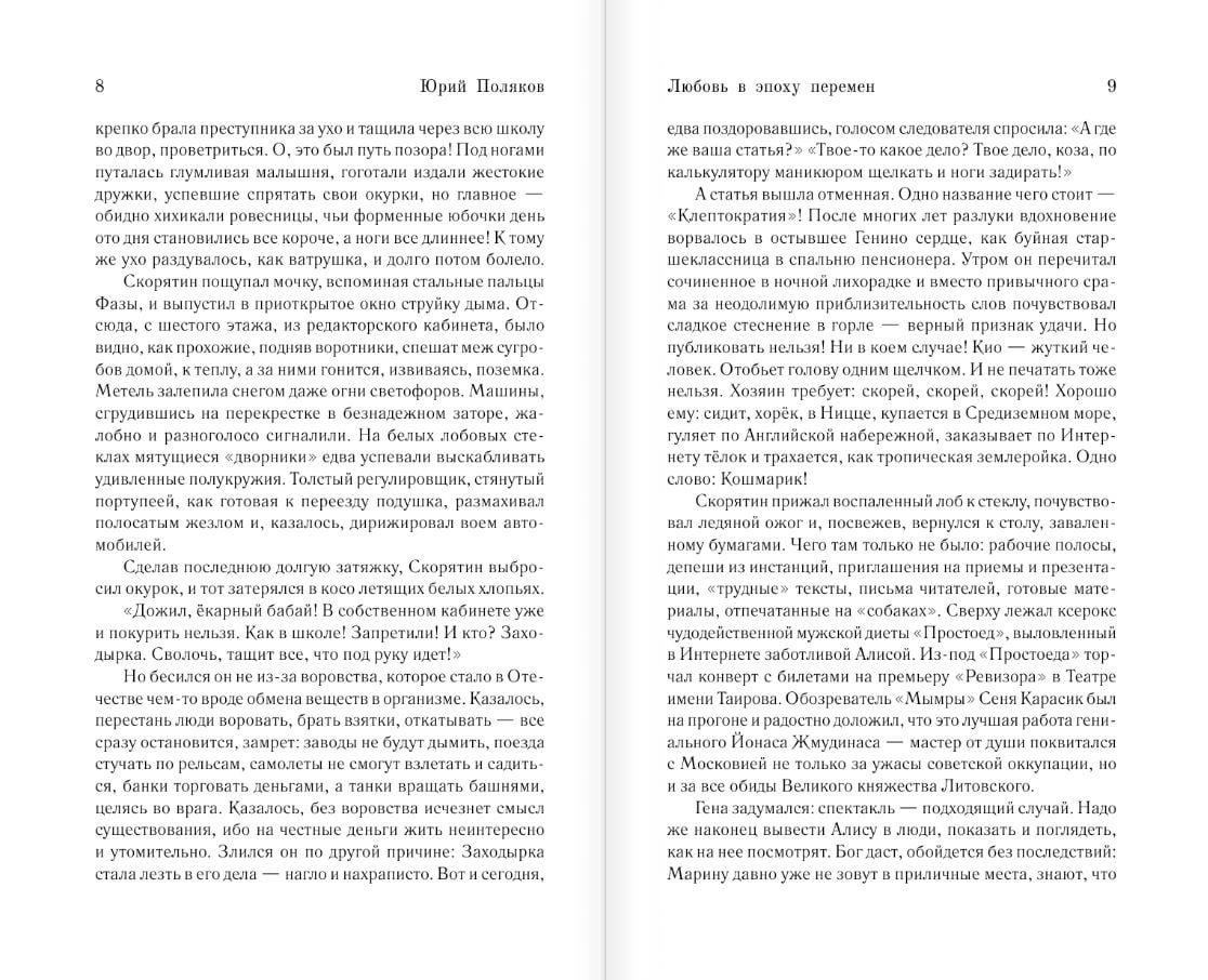 The eighth volume of Yuri Polyakov's collected works includes his bestseller "Love in the Age of Change". This is a novel about novels - about the tender and complex relationship of the main character Gennady Skoryatin, editor of the influential weekly "The World and We", with the three main women in his life. At the same time, it is, in fact, the first attempt in our fine literature to seriously understand Perestroika, dispel its myths and understand the secret springs of that era. As always, the reader is waiting for a sharp plot, vivid characters, polished style, sarcastic satire, unexpected comparisons, bold erotic metaphors ... The book also includes journalistic articles and essays of different years, thematically echoing the novel "Love in the Age of Change".