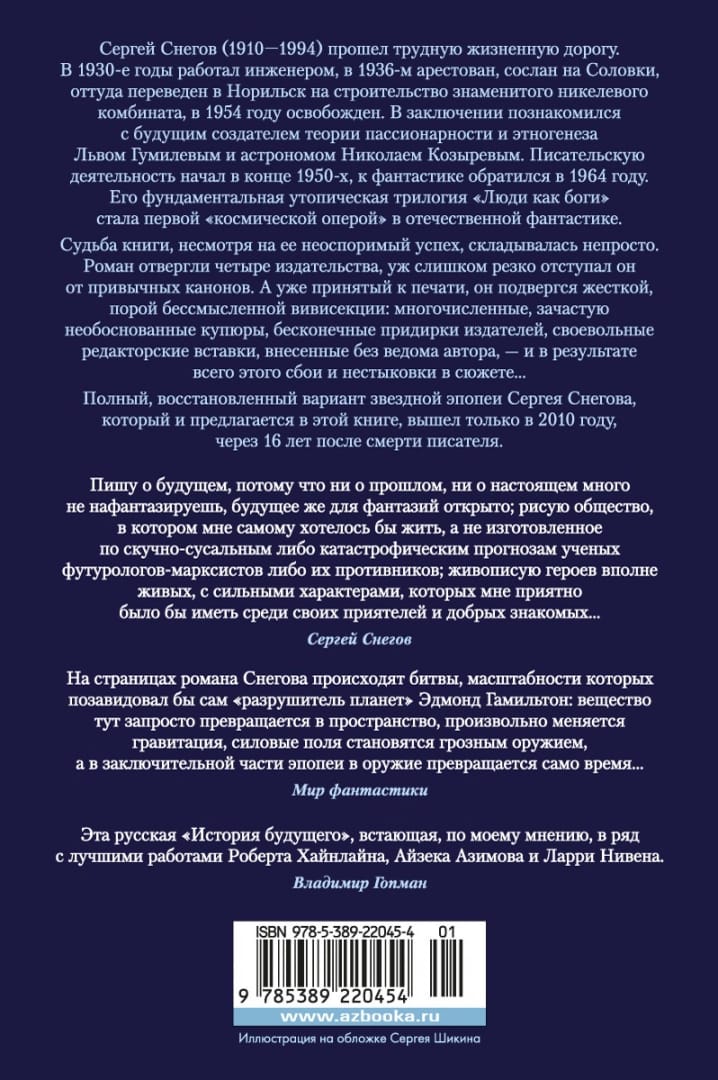The Starfleet of the Earth of the distant future makes a long-distance flight into the depths of the universe. FTL ships "devouring" space and turning it into energy. Civilizations galactovi destroyers, colliding in a star war. Strange forms of intelligence. The ability to control time ... The novel by Sergei Snegov, written in a rare for the Soviet era of the genre of "space opera", rightfully belongs to the best works of domestic fiction, passed the test of time, read and re-read today. The fate of the book, despite its undeniable success, was not easy. The novel was rejected by four publishers, it is too sharply ottsyvala it from the usual canons. And already accepted for printing, he was subjected to severe, sometimes senseless vivisection: numerous, often neobozvoditelnoeoboditelnymi bills, endless nagging publishers, willful editorial insertions made without the knowledge of the author - and as a result of all this failures and inconsistencies in the plot ... The full, restored version of the star epic Sergei Snegov, which is offered in this book, was released only in 2010, 16 years after the death of the writer.