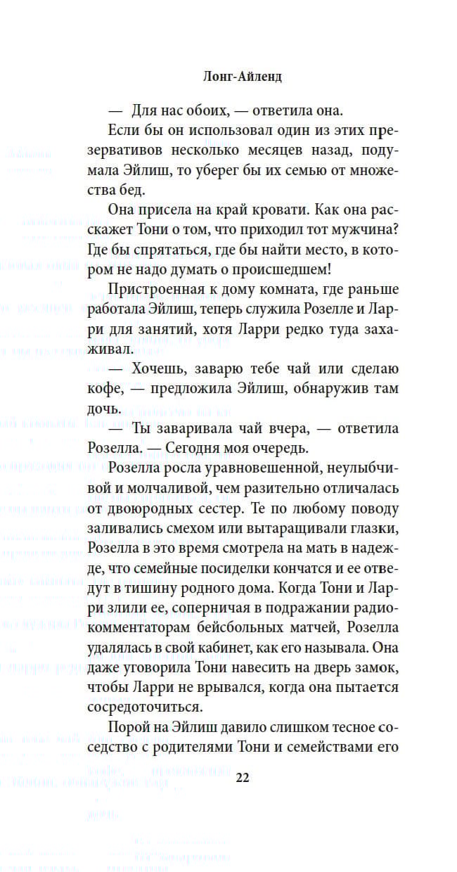 The freshest novel of the modern classic by Colm Toibin, titan of Irish and world literature, winner of many prestigious prizes, multiple Booker finalist, and author of such international bestsellers as The Wizard and The Master. Fifteen years ago, his novel "Brooklyn" - a quiet odyssey of a young Irishwoman Eilish Lacey, who went from her native Enniscorthy to New York - won the hearts of readers around the world, and the screen adaptation of "Brooklyn", directed by John Crowley on the script by Toibin himself and Nick Hornby, won three "Oscars". But the story of Eilish did not let go Toybin - and now, for all his dislike of sequels ("It would be a disaster if "Ulysses" had a sequel ..."), he returned to the beloved heroine. Now, a quarter century has passed since the events of "Brooklyn." Eilish is married to Italian Tony Fiorello, they have two teenage children; they live on Long Island part of a large clan, next to the families of Tony's brothers and his parents. One day, a strange Irishman shows up on her doorstep and declares that his wife is pregnant with Tony's child and that he will not leave the child at home, but will bring it to the Fiorello family under the door and let Tony and Eilish deal with it themselves.