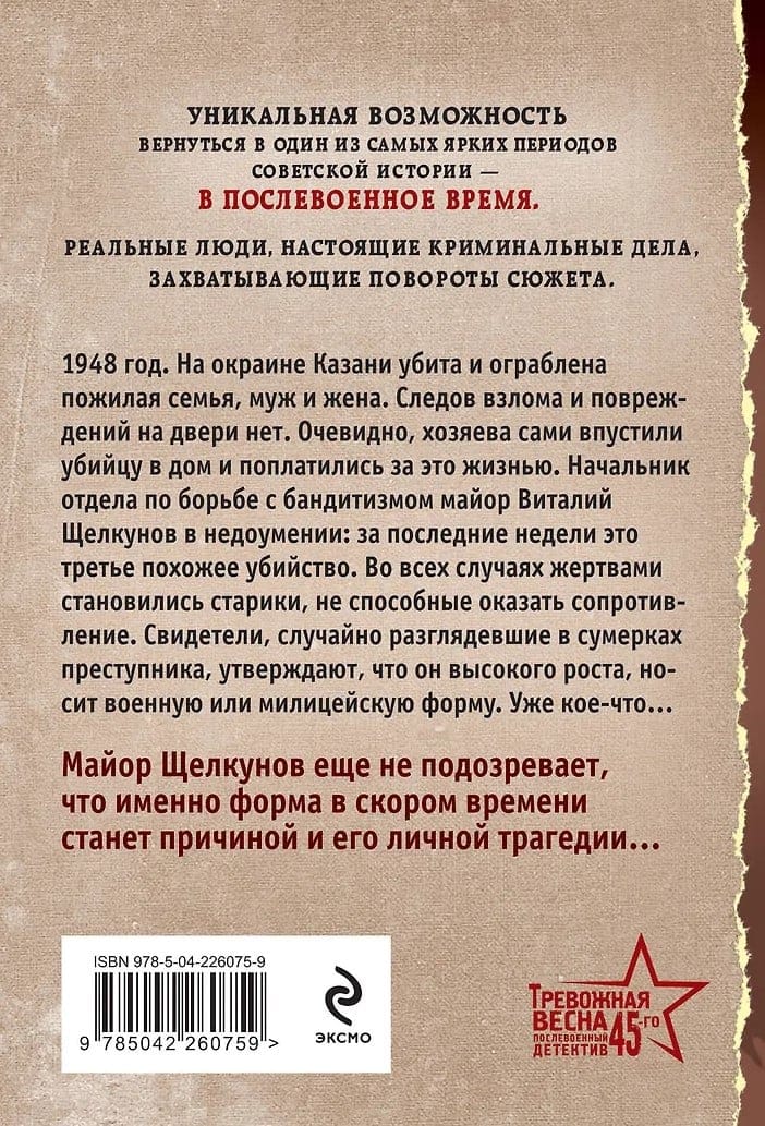 1948. On the outskirts of Kazan, an elderly couple, husband and wife, were murdered and robbed. There were no signs of forced entry or damage to the door. Apparently, the owners themselves let the killer into the house and paid for it with their lives. Major Vitaly Shchelkunov, head of the anti-banditry department, is perplexed: this is the third similar murder in recent weeks. In all cases, the victims were elderly men unable to resist. Witnesses who caught a glimpse of the criminal in the twilight claim he is tall and wearing a military or police uniform. This is already something... Major Shchelkunov doesn't yet suspect that it is precisely this uniform that will soon become the cause of his own personal tragedy...