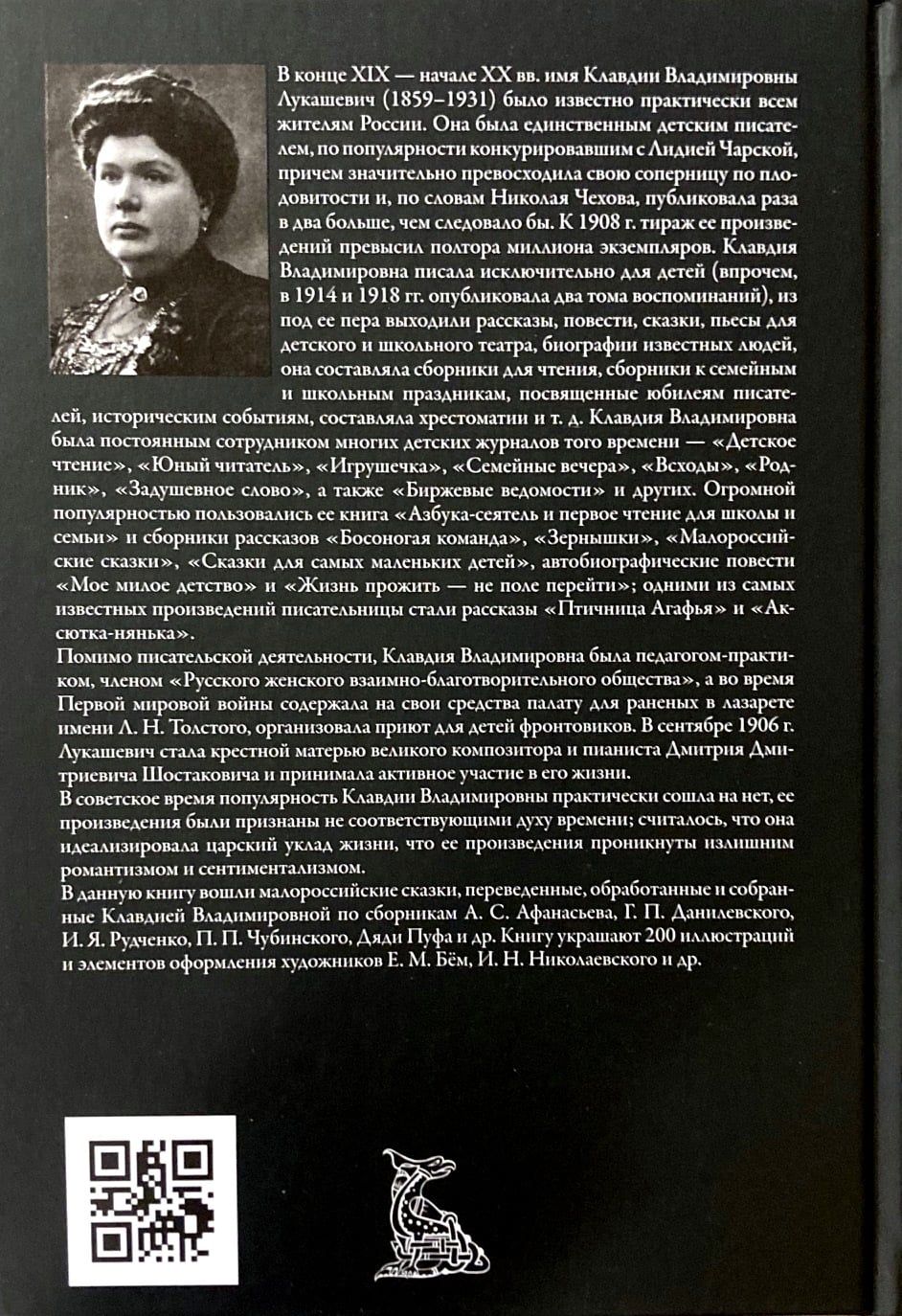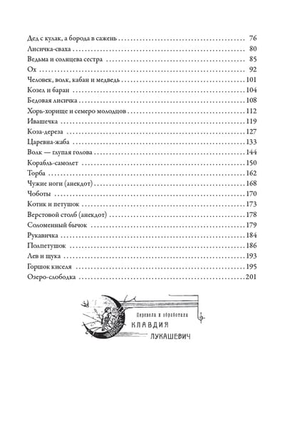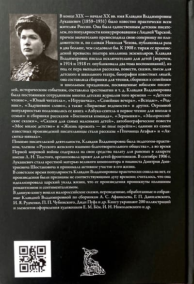 In the late 19th and early 20th centuries, the name of Klavdiya Vladimirovna Lukashevich (1859–1931) was known to virtually everyone in Russia. She was the only children's writer who rivaled Lydia Charskaya in popularity, and was significantly more prolific than her rival and, according to Nikolai Chekhov, published twice as much as she should have. By 1908, the circulation of her works exceeded one and a half million copies. Klavdiya Vladimirovna wrote exclusively for children (however, in 1914 and 1918 she published two volumes of memoirs), from under her pen came stories, novellas, fairy tales, plays for children's and school theater, biographies of famous people, she compiled collections for reading, collections for family and school holidays dedicated to the anniversaries of writers, historical events, compiled anthologies, etc. Klavdiya Vladimirovna was a regular employee of many children's magazines of that time - "Children's reading", "Young reader", "Igrushechka", "Family evenings", "Shoots", "Rodnik", "Soulful word", as well as "Stock Exchange News" and others. Her book "Azbuka-seyatel and the first reading for school and family" and collections of stories "Barefoot team", "Grains", "Little Russian tales", "Tales for the youngest children", autobiographical stories "My sweet childhood" and "Living life is not a field to cross" enjoyed great popularity; some of the writer's most famous works were the stories "Birdwoman Agafya" and "Aksyutka-nanny". In addition to writing, Klavdia Vladimirovna was a practical teacher, a member of the "Russian Women's Mutual Charity Society", and during the First World War she maintained a ward for the wounded at the L. N. Tolstoy hospital at her own expense, and organized a shelter for children of front-line soldiers. In September 1906, Lukashevich became the godmother of the great composer and pianist Dmitry Dmitrievich Shostakovich and took an active part in his life. During the Soviet era, Klavdiya Vladimirovna's popularity practically disappeared, her works were considered not to correspond to the spirit of the times; it was believed that she idealized the royal way of life, that her works were imbued with excessive romanticism and sentimentalism. This book includes Little Russian fairy tales translated, processed and collected by Klavdiya Vladimirovna from collections by A. S. Afanasyev, G. P. Danilevsky, I. Ya. Rudchenko, P. P. Chubinsky, Uncle Puf and others.