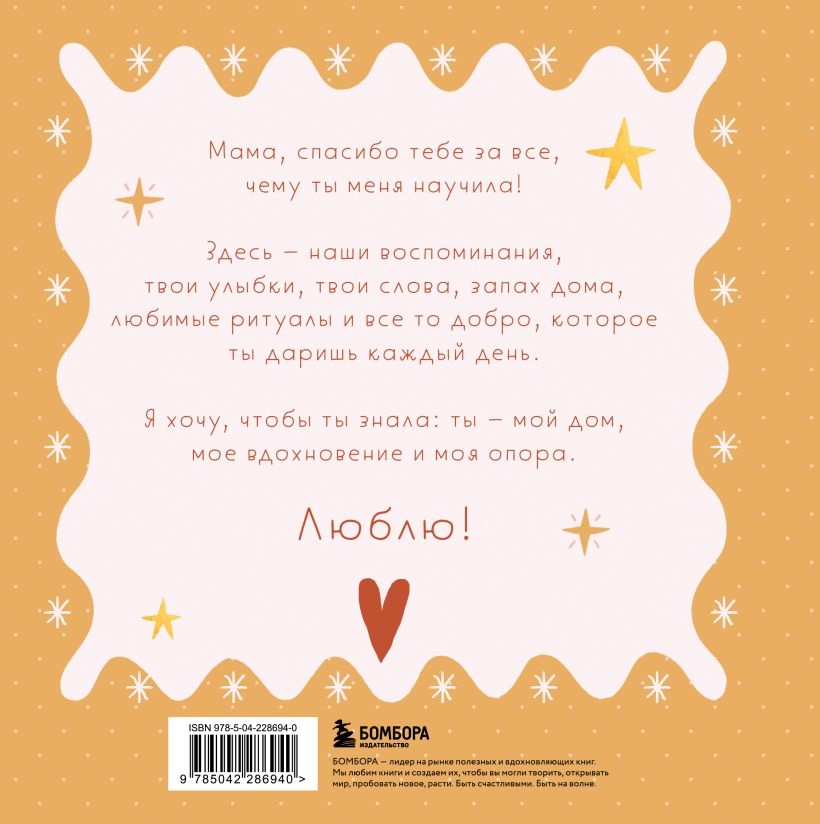This isn't just a book—it's a place for your shared story. There's no pre-written text here, because the main character is your mom, and the author is you. The 64 pages are filled with questions, creative tasks, and cozy spreads that will help you tell her everything that usually goes unsaid. You'll tell your mom why you love her, what her superpowers are, and what your fondest memories are. Include your favorite photos, reminisce about funny stories and jokes, describe traditions, recipes, songs, and dreams. Letters, confessions, then-and-now photos—all of this will become a treasured reminder of closeness and support. The book will live and change, because you can add to it even after you've given it to her.