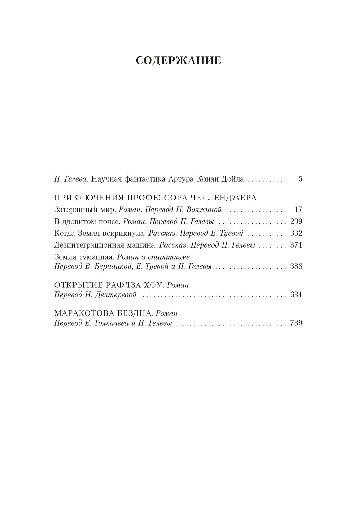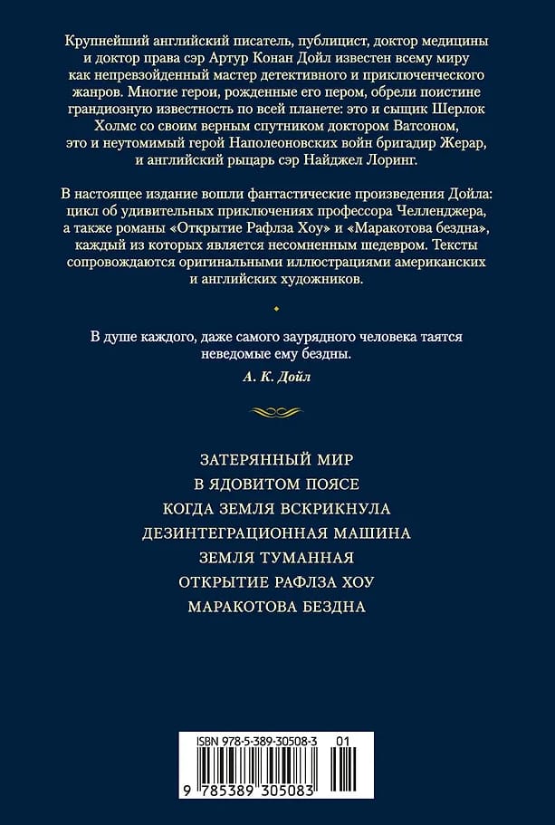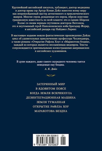 This edition includes Doyle's fantastic works: the cycle about the amazing adventures of Professor Challenger, as well as the novels "The Discovery of Raffles Haw" and "Maracot Deep," each of which is an undisputed masterpiece. The texts are accompanied by original illustrations by American and British artists.