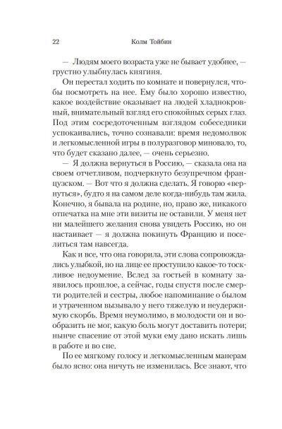 This modern classic pays tribute to one of the pillars of American and world literature, a forerunner of modernism. An outstanding artist, a master of subtle psychological portraiture, is shown in all his vulnerability and loneliness - from the failure of the production of his play "Guy Domville" at London's Drury Lane Theatre, while in a neighboring theater the audience applauds the premiere of Oscar Wilde's "How Important It Is to Be Serious", before a visit to the provincial English town of Paradise, where James settled in his declining years, by his brother, the philosopher William James, and with numerous reminiscences of key episodes in the biography of the celebrated voluntary exile who preferred London, Florence and Paris to his native Boston....