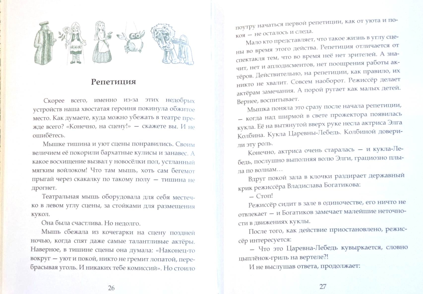 "It seems like a book about theater, but what does a workshop have to do with it?" someone might ask. Because there are masters working there! And don't be afraid to call each of them a maestro, after all, the Italian word "maestro" translates as "master." Although, the story's main character, a mouse, isn't exactly what you'd call a maestro. But she's no ordinary mouse either; she's a theatrical one! And thanks to her, the reader will visit the stage, the set warehouse, the art and decoration workshop, and much more... She'll even take a trip (almost on tour!) with her performance to a holiday resort. Welcome, dear reader, behind the scenes of a puppet theater!