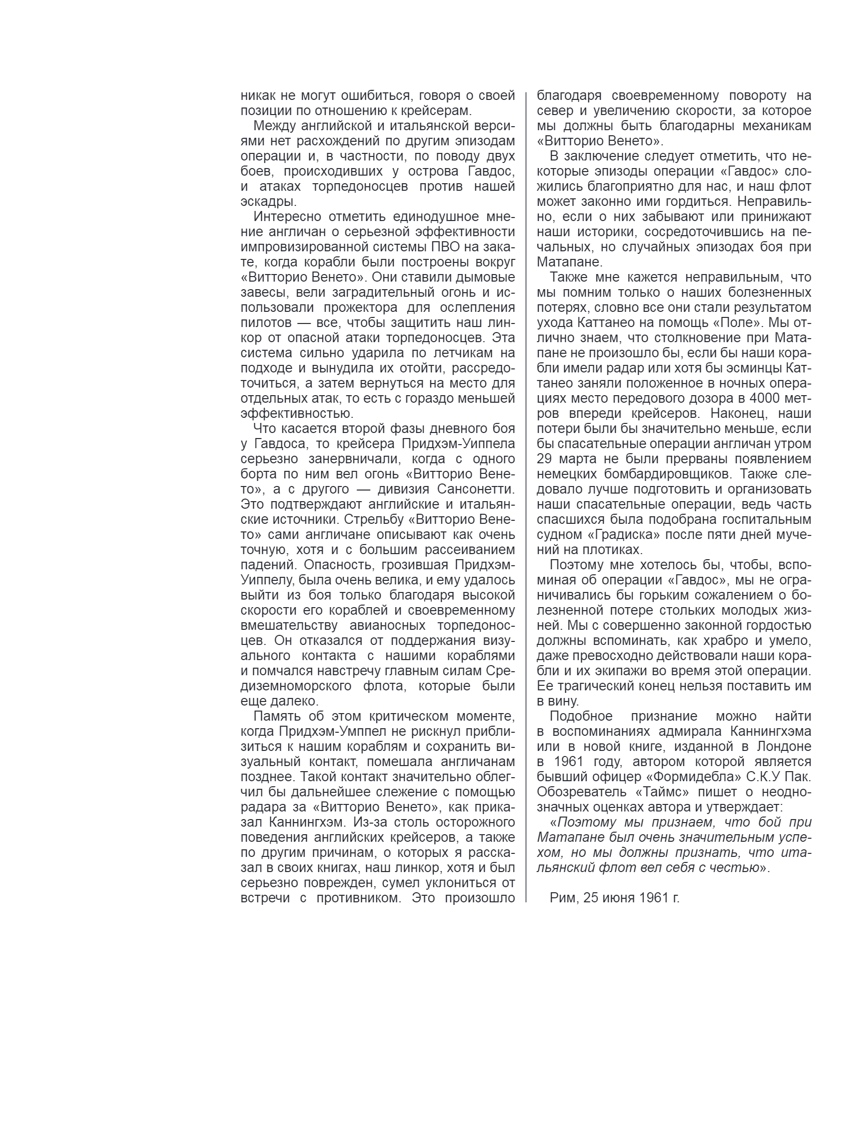The Battle of Cape Matapan, March 27-29, 1941, was the largest and most effective naval confrontation in the Mediterranean Sea during World War II. For the first time in history, the outcome of a battle at sea was decided by deck aviation. It was after Matapan that aircraft carriers became the most formidable opponents of battleships. Admiral Cunningham's squadron at the extreme southern point of Greece inflicted such a crushing defeat on the Italians that they could not recover from it until the surrender of the Royal Italian Navy (Regia Marina). The losses of Mussolini's fleet amounted to three heavy cruisers, two destroyers, more than two thousand sailors killed, as well as serious damage to the battleship "Vittorio Veneto". At the same time, the British, who would dominate the Eastern Mediterranean until the German army captured Crete, lost only one torpedo-bearing aircraft along with a crew of three. The defeat off Cape Matapan meant that the Italian Navy effectively no longer took any active part in the fighting, even despite its technical and numerical superiority. A large force of Mussolini's fleet would now only put to sea in September 1943 and only to surrender to the Allies in Malta.