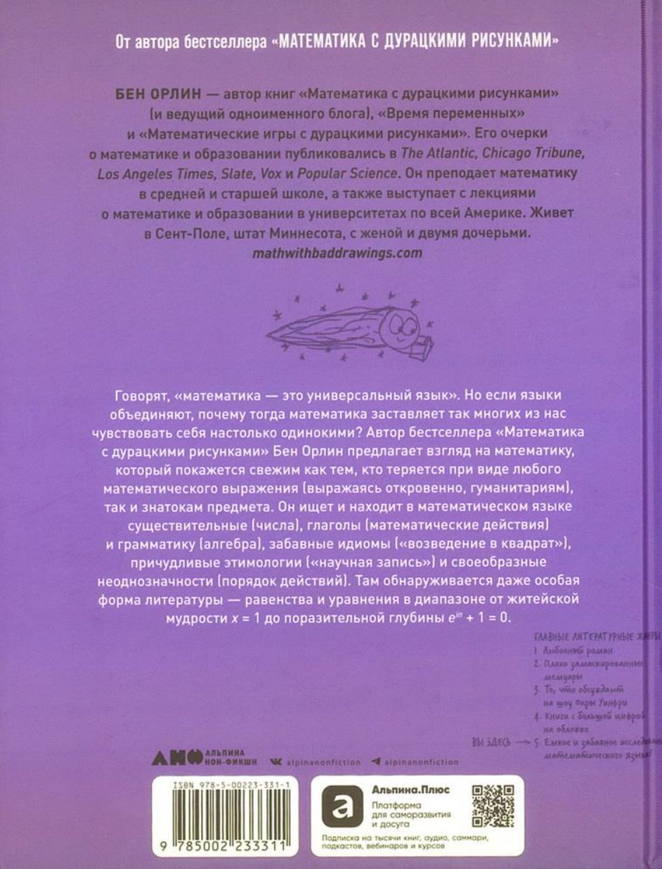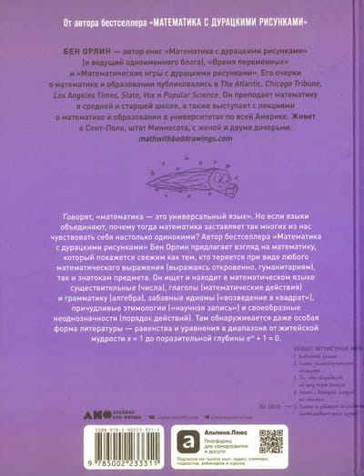 In Math for People Afraid of Math: Another Book with Silly Drawings, Orlin offers a perspective that will be refreshing to those who are at a loss for any mathematical expression (let’s be honest, humanities students) as well as to those who know the subject. Orlin searches for and finds in the language of mathematics nouns (numbers), verbs (mathematical operations), and grammar (algebra), funny idioms (squaring), quirky etymologies (scientific notation), and peculiar ambiguities (order of operations). There’s even a special form of literature—equations and equations ranging from the common wisdom of x = 1 to the astonishing profundity of eiπ + 1 = 0. Along the way, Orlin shares stories of his own mathematical failures and epiphanies, as well as the struggles and triumphs of his students. Most important, he uses his awkward—but surprisingly effective—illustrations to illuminate some pretty deep and varied questions. What exactly is high school math? Why is it so hard for so many of us to learn anything useful from it? Can shuffling symbols teach us anything new about reality? And how does math even work?
