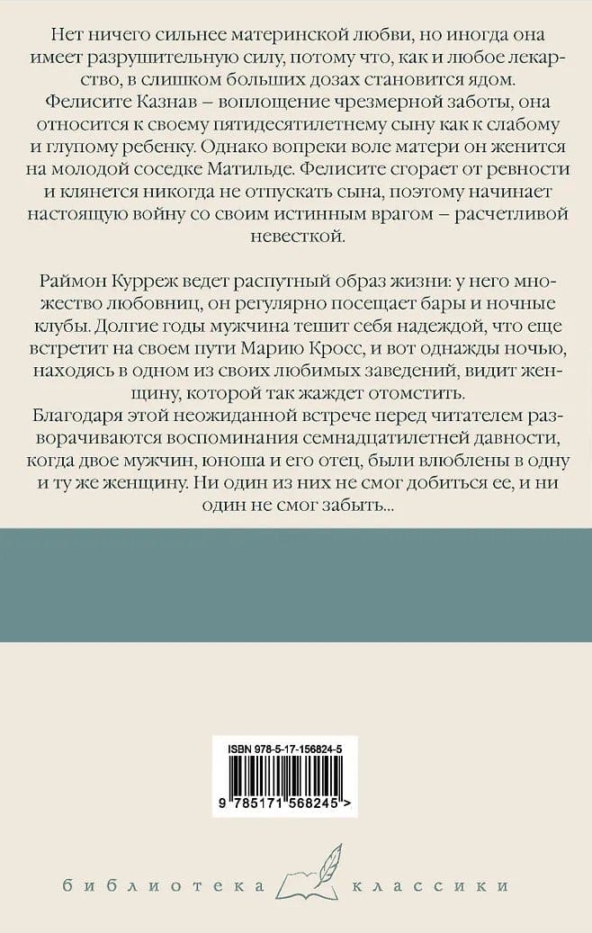 Raymond Courrèges leads a dissolute life: he has numerous mistresses and regularly frequents bars and nightclubs. For years, he cherishes the hope that he will again encounter Maria Cross, and then one night, while at one of his favorite establishments, he sees the woman he so desperately desires revenge on. This unexpected encounter unfolds before the reader's eyes a memory from seventeen years ago, when two men, a young man and his father, were in love with the same woman. Neither could win her, and neither could forget her...