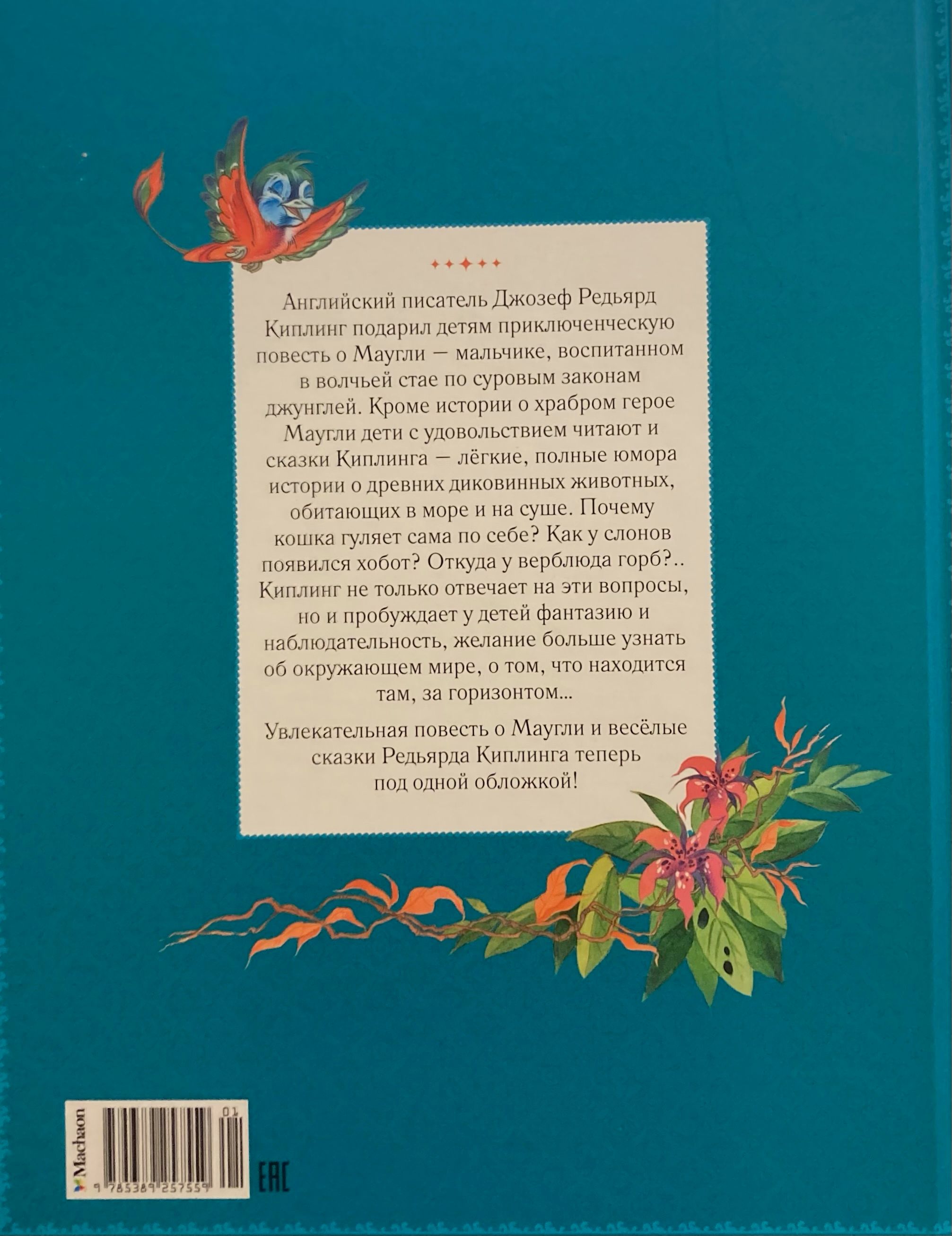English writer Joseph Rudyard Kipling gave children an adventure story about Mowgli - a boy brought up in a wolf pack under the harsh laws of the jungle. In addition to the story of the brave hero Mowgli children enjoy reading and Kipling's fairy tales - light, full of humor stories about ancient outlandish animals living in the sea and on land. Why does a cat walk by itself? How did elephants get a trunk? Where does a camel get a hump...? Kipling not only answers these questions, but also awakens children's imagination and observation, the desire to learn more about the world around them, about what is out there, beyond the horizon... The fascinating story of Mowgli and funny tales of Rudyard Kipling are now under one cover.