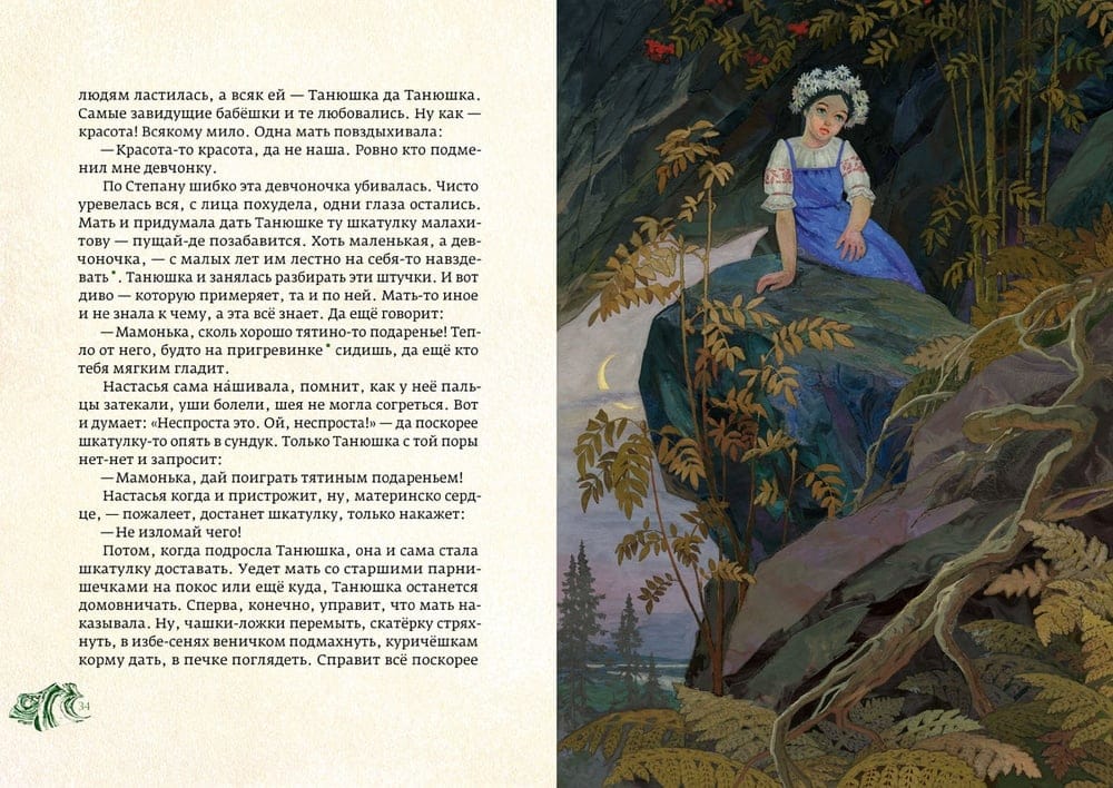 The Gumyoshki mine, where copper ore was extracted for the nearby Polevsky plant since the 18th century, was famous for various miracles. And not without reason: the power here belonged to the Mistress of the Copper Mountain. She could take on different guises: she could turn into a lizard or a laughing girl, she could enter a house as a wanderer or a sovereign lady in her kingdom to receive guests. But in any guise, the Mistress liked to "make wisecracks on a man": she would give a difficult task - and the clerk would punish the worker severely; she would beckon a mysterious stone flower - and the master would go to her mountain forever. And in the mountain "the rooms are big... and their walls are different. They are green, or yellow with golden speckles. On which there are copper flowers again. There are blue ones too, azure. In a word, it's decorated to say the least". This beauty of the Ural land, the incredible richness of the Ural mountains with love and deep knowledge of the nature of stone was conveyed by the artist Vyacheslav Nazaruk, who has devoted several years to illustrating the most famous tales of Pavel Bazhov.