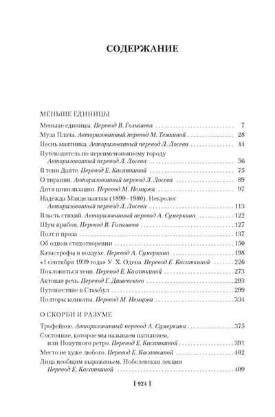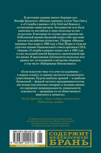This edition includes a collection of essays by Joseph Brodsky, Less Than One and On Grief and Reason, compiled by the author himself. Most of the essays were written in English and only a few in Russian. In an interview on the occasion of his Nobel Prize, Brodsky called himself "a Russian poet and an English essayist". Less Than One was published in 1986 in New York and won the National Board of Critics Award in 1986; On Sorrow and Reason was published in 1995 and was Brodsky's last book published during his lifetime. The appendix contains several essays from different years that were not included in the author's collections, including "Quay of the Unhealed.