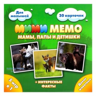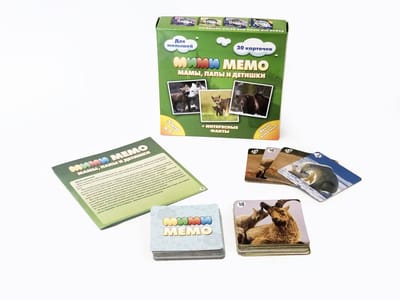 Mi-mi-memo is a game for memory and attention development. This is a classic memory game with paired cards. The cards show pictures of pets with cubs. Such cute pictures are often called mimimishnye, hence the prefix to the name of the game. The rules of the game are simple. Before starting the game, the cards are mixed and laid out on the table with the pictures down. Several players play. On his turn a player turns over 2 cards of any kind and shows them to the other players. If the cards are the same, he takes them and makes another turn. If they are different, he turns them over and puts them back, and the turn goes to the next player. The player who collects the most cards by the end of the game wins. The game includes a brochure with descriptions of animals and interesting facts about their lives. Such a set can also be used as a didactic material, familiarizing the baby with the names of pets and their cubs. In addition to the memo game, the authors suggest organizing other games: "Name the whole family", "Who is faster", "Who was here", "Chains". Memori trains memory and attention, which is very important for a child. At the same time, the game will be interesting for both children and adults. And do not think that you can easily beat the child, in fact, it is often not so. There are several sets in the series of Mi-Mi-Memo. At the same time, all the cards have the same shirts. Therefore, the decks can be mixed, complicating the game. In the set: 15 pairs (30 cards) with pictures of animals with cubs, -brochure with rules and description of animals. Card size: 7,5x7,5 cm. Material: dense binding cardboard. Packaging: cardboard box 15,5x15,5x3,5 cm.