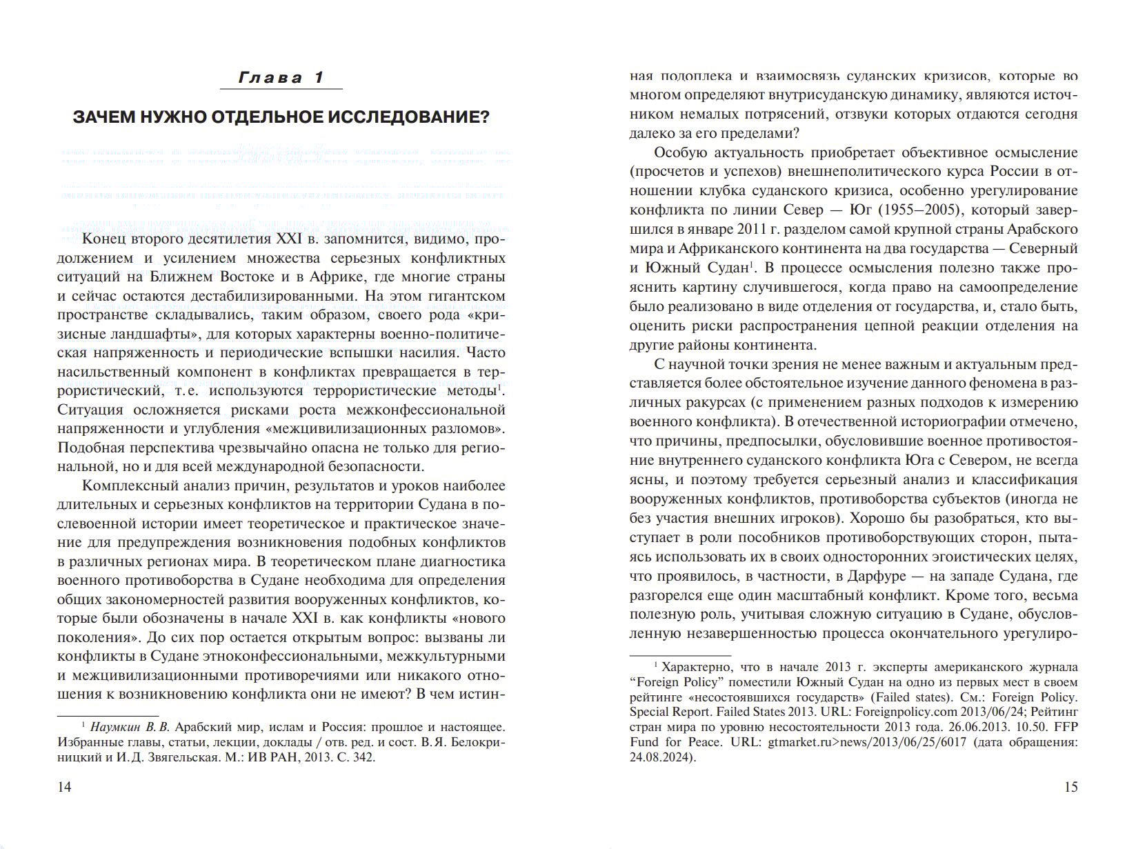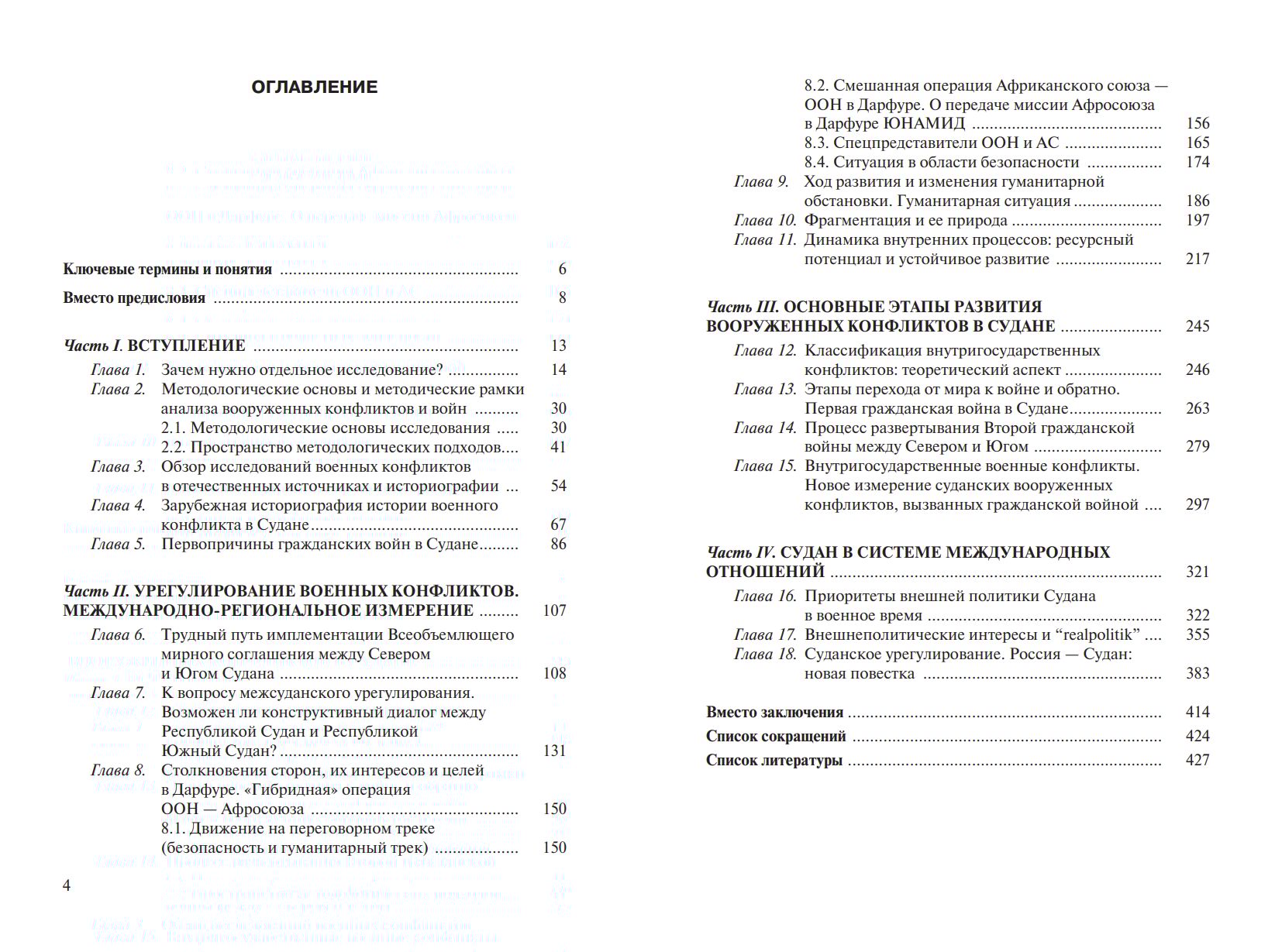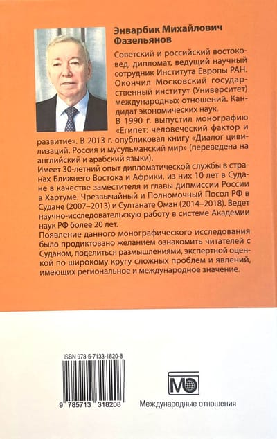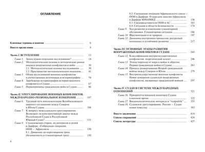 The book examines in detail two major conflicts: the North-South standoff (1955–2005), which culminated in the signing of the Comprehensive Peace Agreement and the subsequent partition of the country in 2011, and the Darfur crisis (2003–2020), one of the most tragic episodes in modern African history. It also examines Russia's role in resolving these conflicts. A significant focus is given to UN peacekeeping, whose effectiveness is assessed critically and through practical lessons.