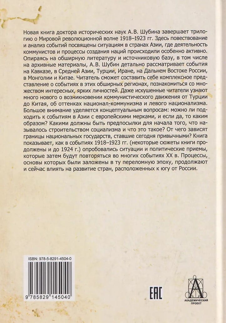 A new book by Doctor of Historical Sciences A.V. Shubin completes his trilogy on the World Revolution of 1918–1923. Here, the narrative and analysis of events focus on the situations in Asian countries, where communist activity and nation-building were particularly active. Drawing on extensive literature and source material, including archival materials, A.V. Shubin examines in detail the events in the Caucasus, Central Asia, Turkey, Iran, the Russian Far East, Mongolia, and China. Readers will gain a comprehensive understanding of the events in these vast regions and become acquainted with a multitude of interesting and vibrant personalities. Even seasoned readers will learn a great deal about the emergence of the communist movement from Turkey to China, and the nuances of national communism and left-wing nationalism.